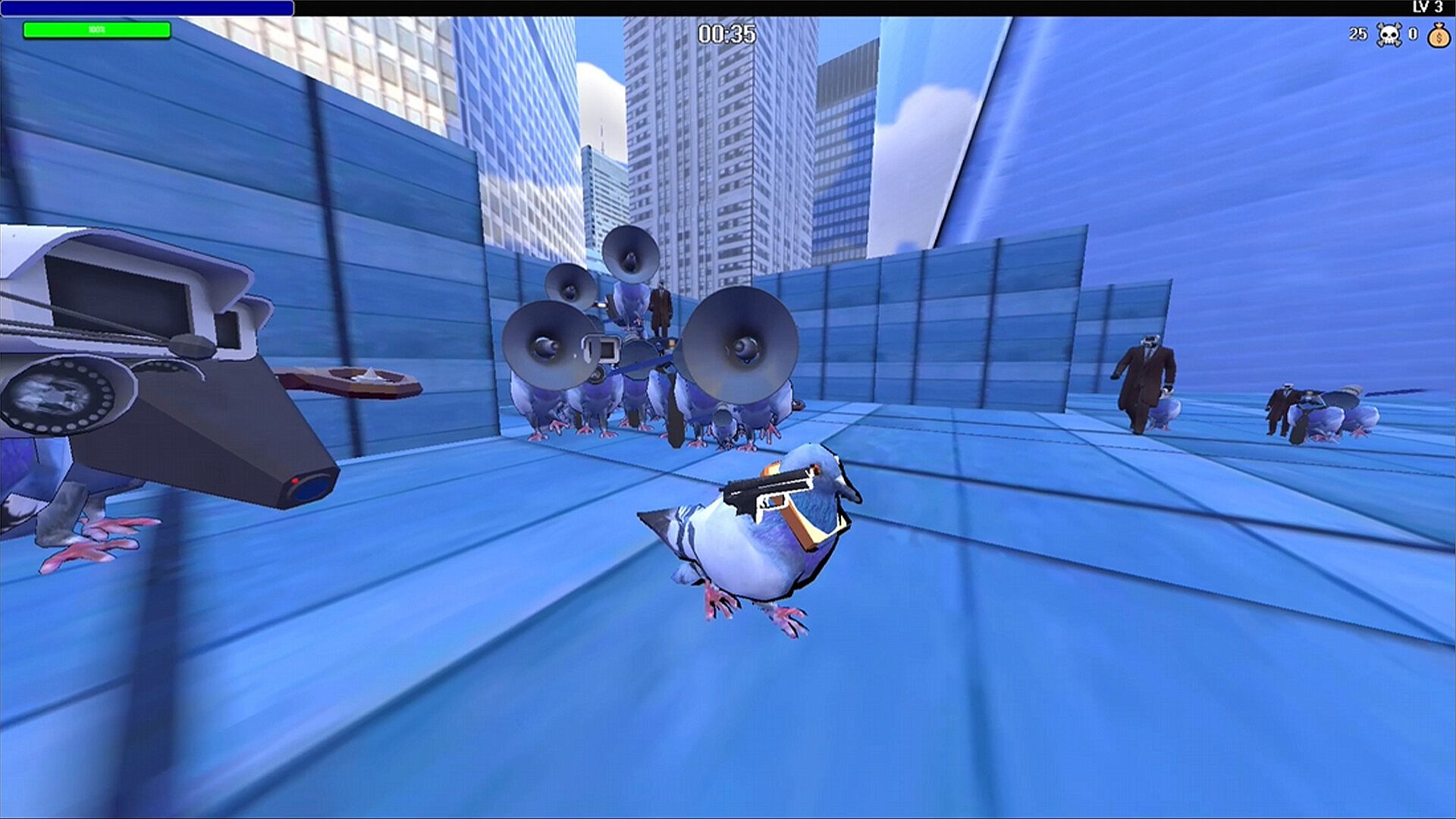 The sole survivor: Agent Pigeon 7, the only pigeon capable of wielding 6 weapons at once. Stranded and awaiting backup, Agent Pigeon 7 must survive waves of relentless government drones in this roguelike survival game.