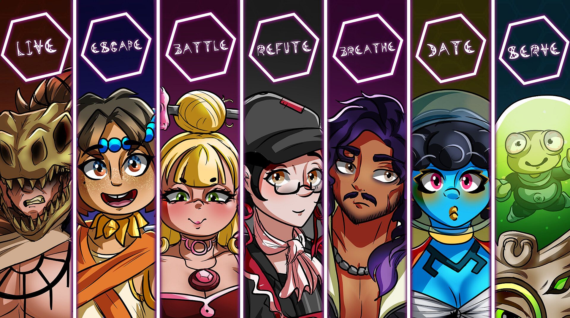 AGERASIA is a visual novel style, comedic narrative-driven game which centres around eight unique participants, each one hailing from a different point in human history. You will follow Camden Connolly, born and raised in the Modern Era, they find themselves in an unfamiliar situation alongside seven other colourful characters, each from a different Era of human history - going as far back as Prehistory, all the way up to the Distant Future. Finding themselves at the whims of a curious floating blobfish known as Rantan, the eight are tasked with using time travelling lanterns to compete against each other in a bid to restore a supposed reality-bending world event.