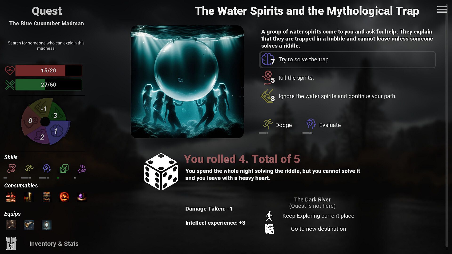 • 100 Quests: Experience a variety of AI-generated stories. Some are epic, some tragic, some absurd, and some downright bizarre. Each one is unique and creative.