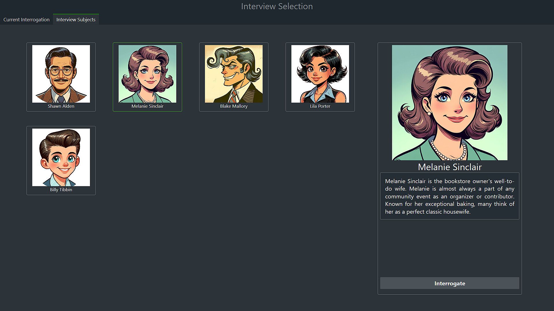 Each suspect will be powered by a Large Language Model (LLM) such as those provided by OpenAI (e.g., GPT), Anthropic (e.g., Claude) or a local model (e.g., Llama). By connecting your own AI to the game, you will experience an AI-powered video game with unprecedented power and control.