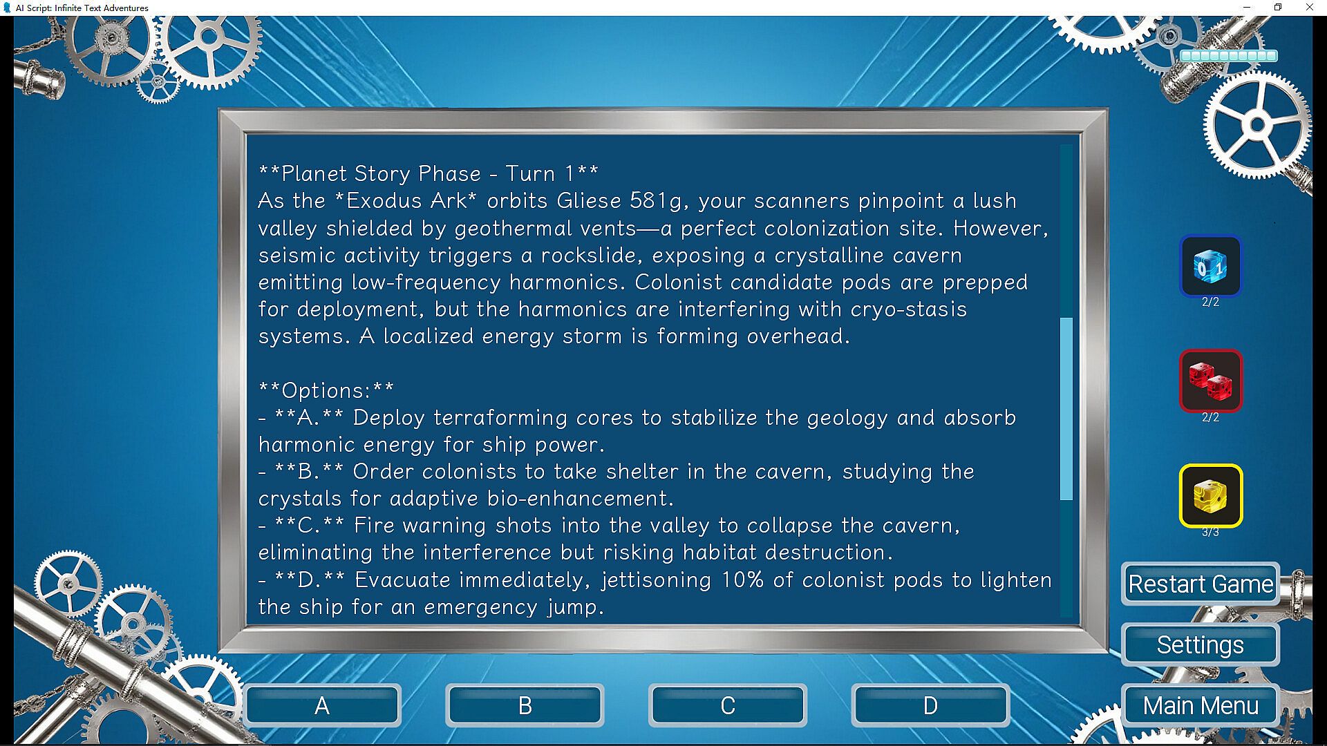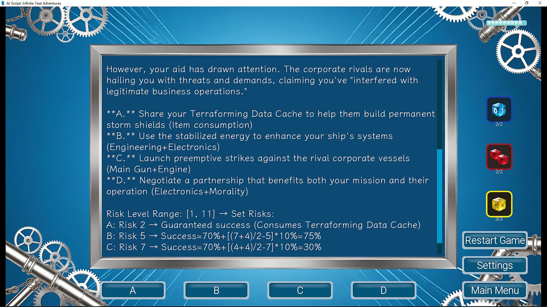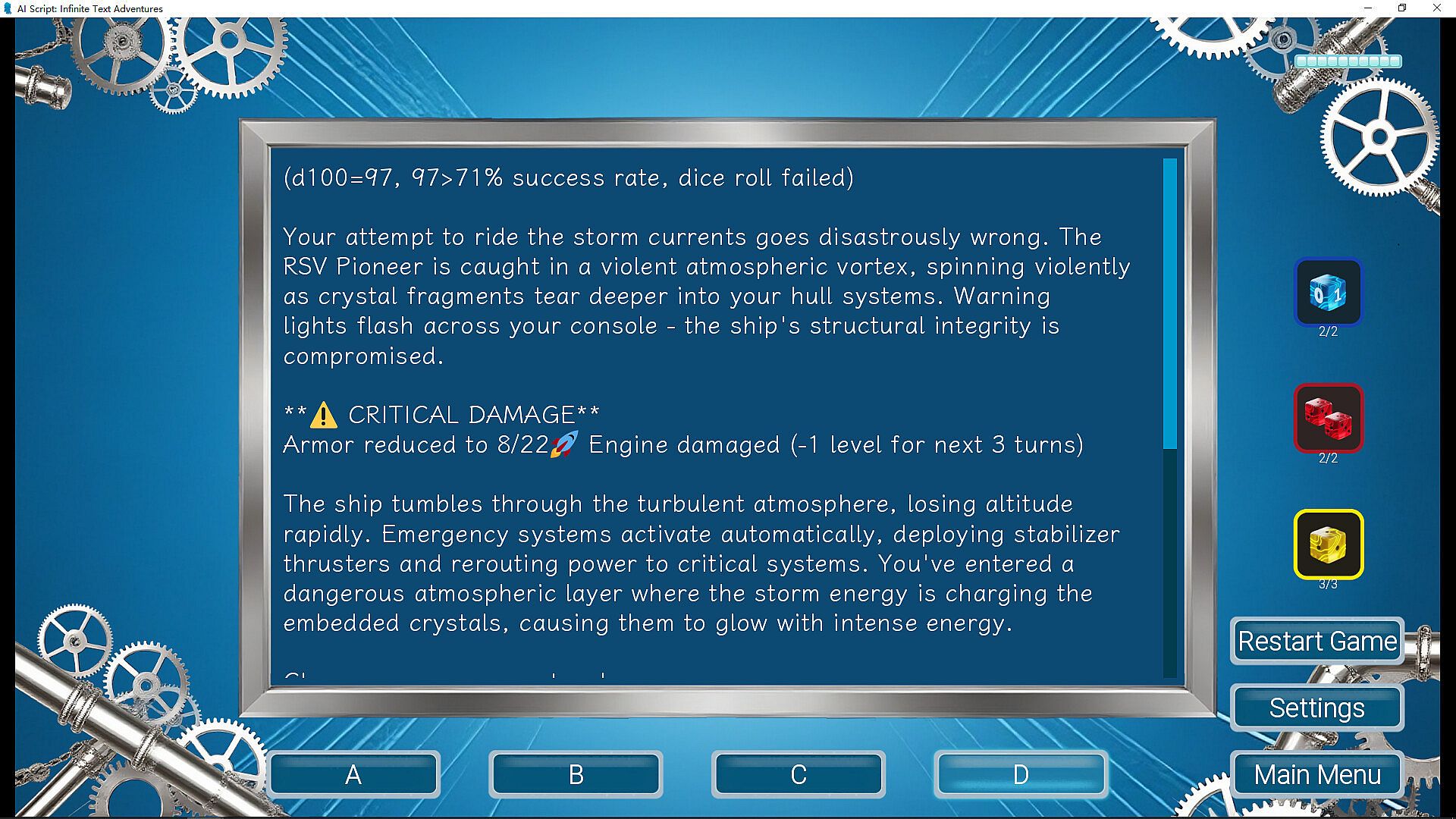 When faced with crucial choices (ABCD) presented by the AI, you must weigh their different success rates. Roll the decisive dice and feel the dramatic tension where strategy meets luck, hanging in the balance between success and failure.
