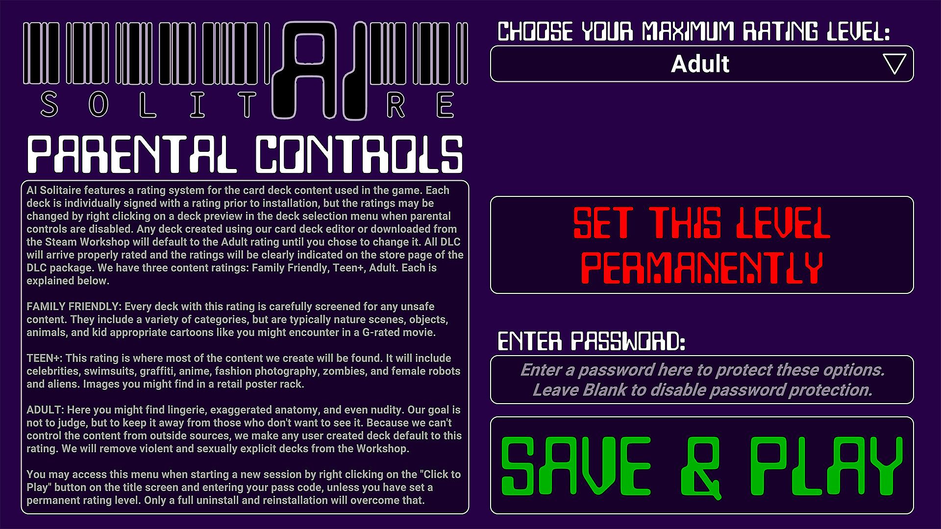 The 18 deck styles in the base game include 3 traditional playing card decks and 15 AI art-based card decks. 3 card decks are rated "Family Friendly". 15 card decks are rated "Teen+". There are no "Adult" rated card decks included in the base game. None of the decks in the base game include any nudity.