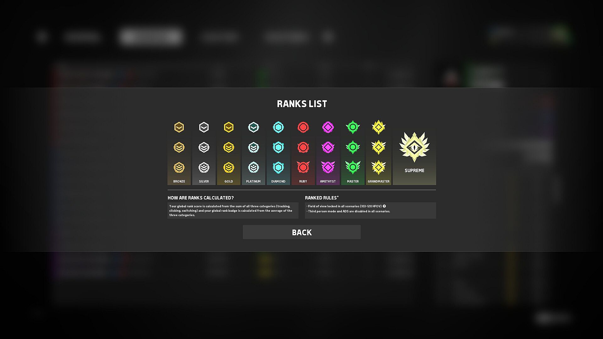 Ranked features multiple ranked playlists made by different communities, focusing on three essential skill categories: clicking, tracking, and switching. You will get a rank ranging from bronze to grandmaster, which will motivate you during your training. Non-ranked scenarios also assign a rank based on your leaderboard position.