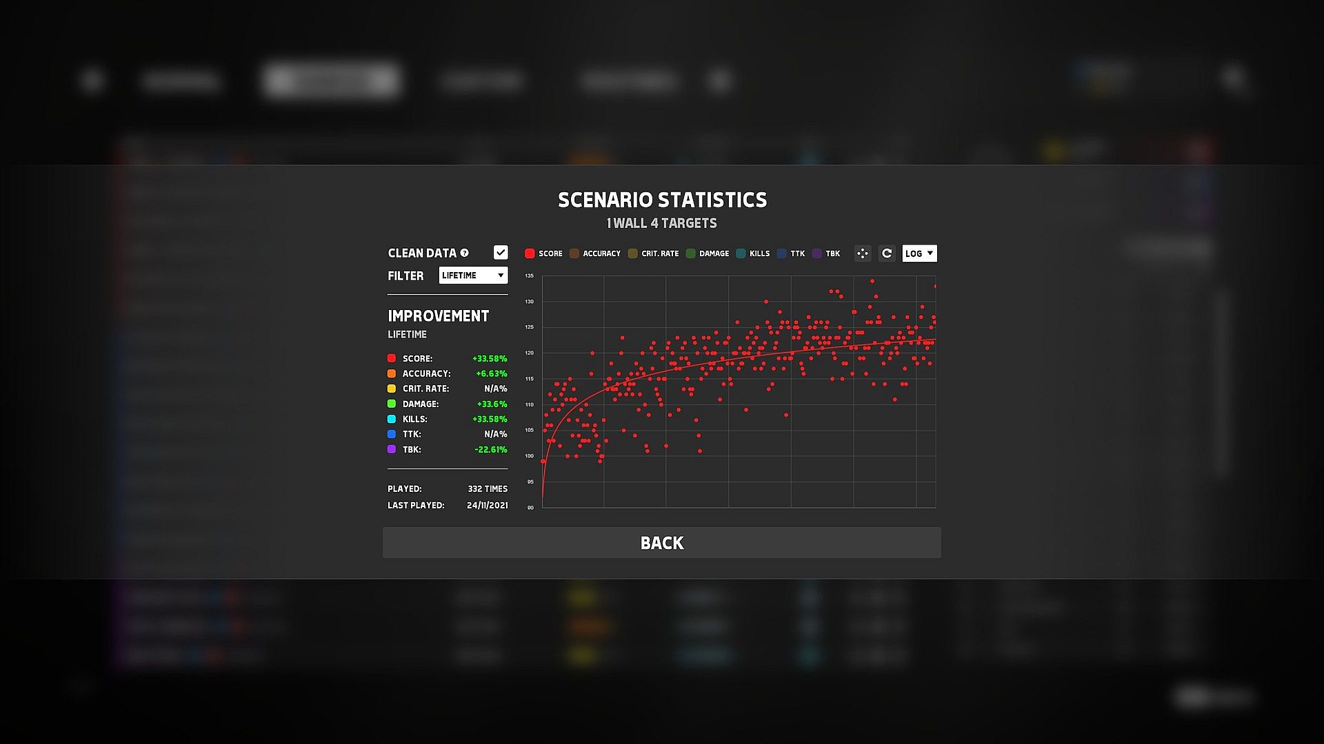 You can track your progress on any scenario you play and view a graph showing how much you are improving over time. You can also filter by date or by parameter (score, kills, accuracy, etc..) and get an idea of the improvement over individual aspects of each scenario.