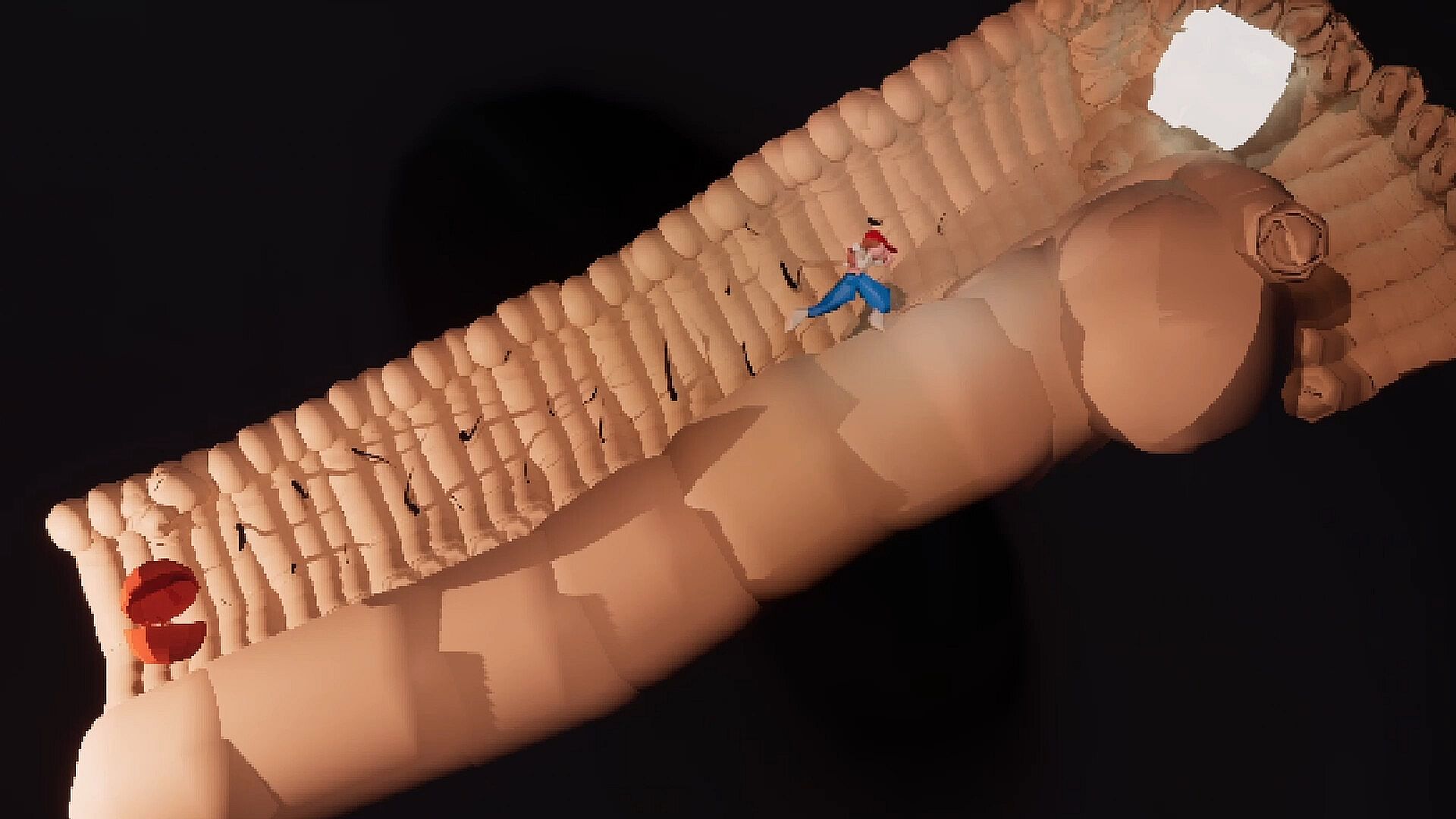 Your shrinking machine has a grappling hook which you can use to swing into Adam and launch yourself inside his body, where it's up to you to kill the spiders infesting him.