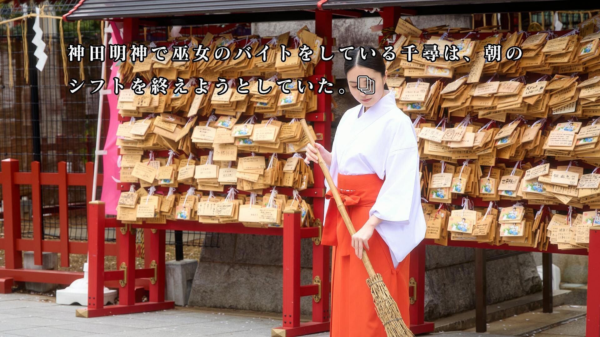 A shrine maiden working part-time at Kanda Myojin, the guardian deity of Akihabara.