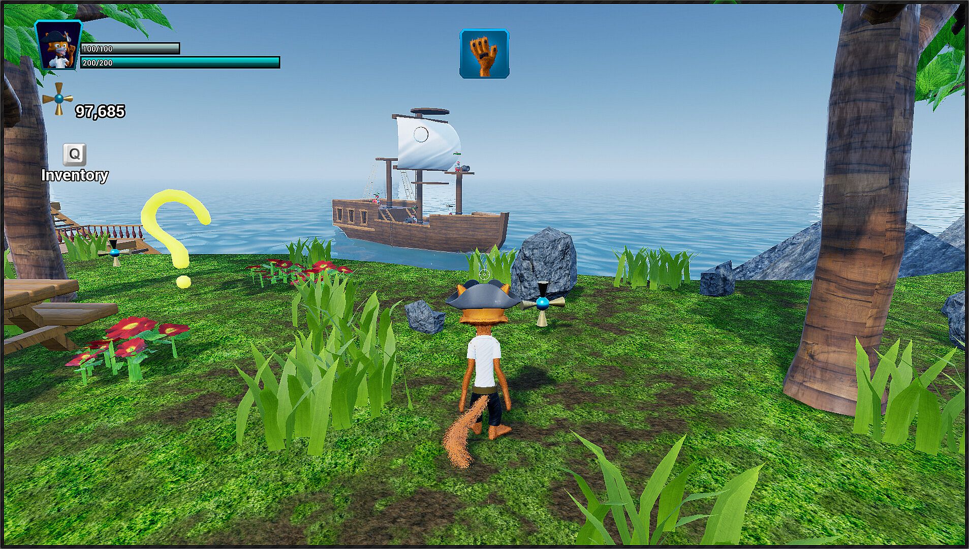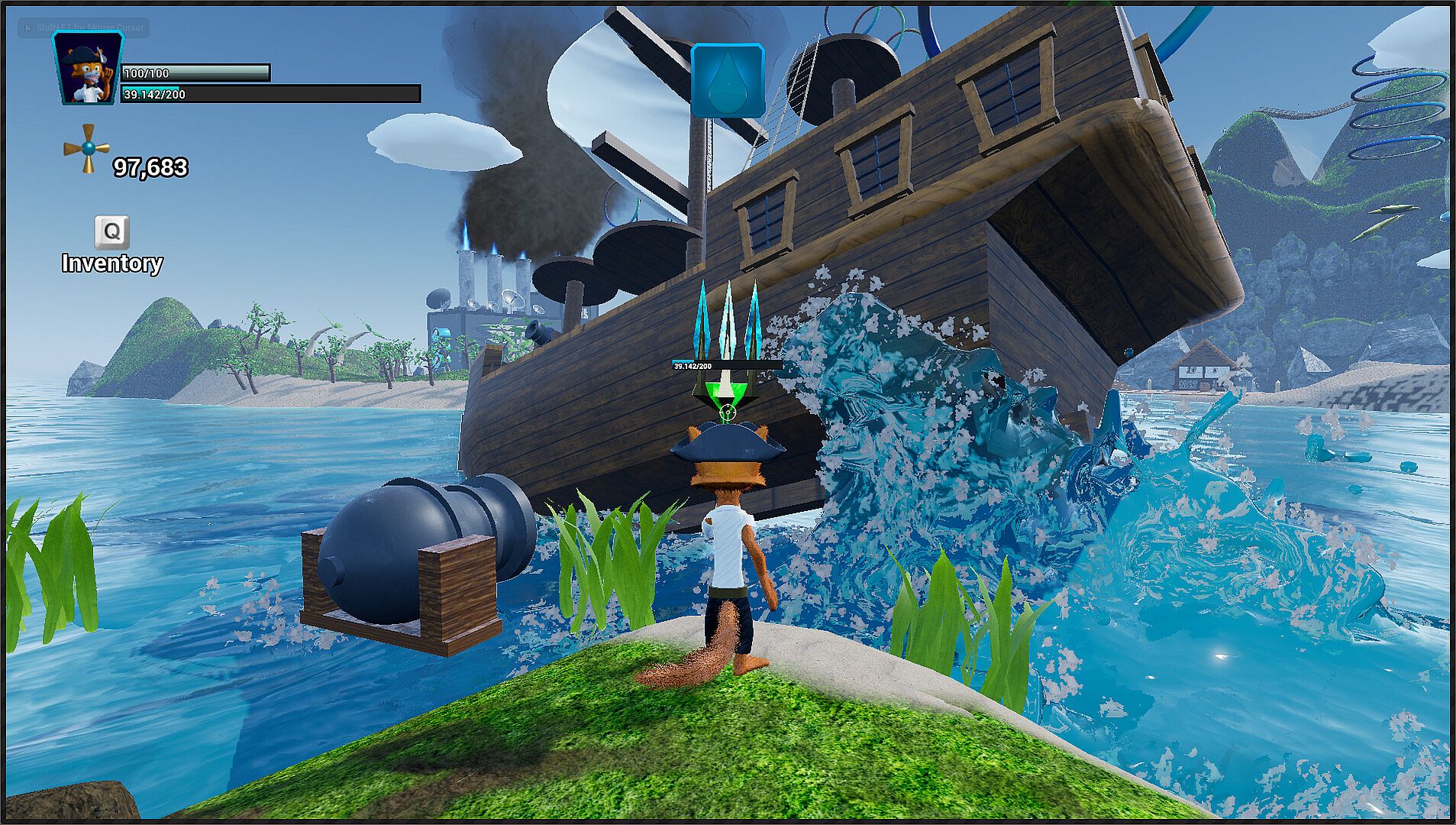 Explore the island, collect treasure, buy and unlock powerful items each with different unique effects such as damage, healing and freezing, combine and strategize the effects of your items to use them to destroy enemies as quick as possible, dodge attacks from turrets all over the island such as rockets and lasers, infiltrate a highly secured facility with different types of dangers and puzzles, drive a boat armored with a cannon to aim and shoot the pirate battleship until it goes down.