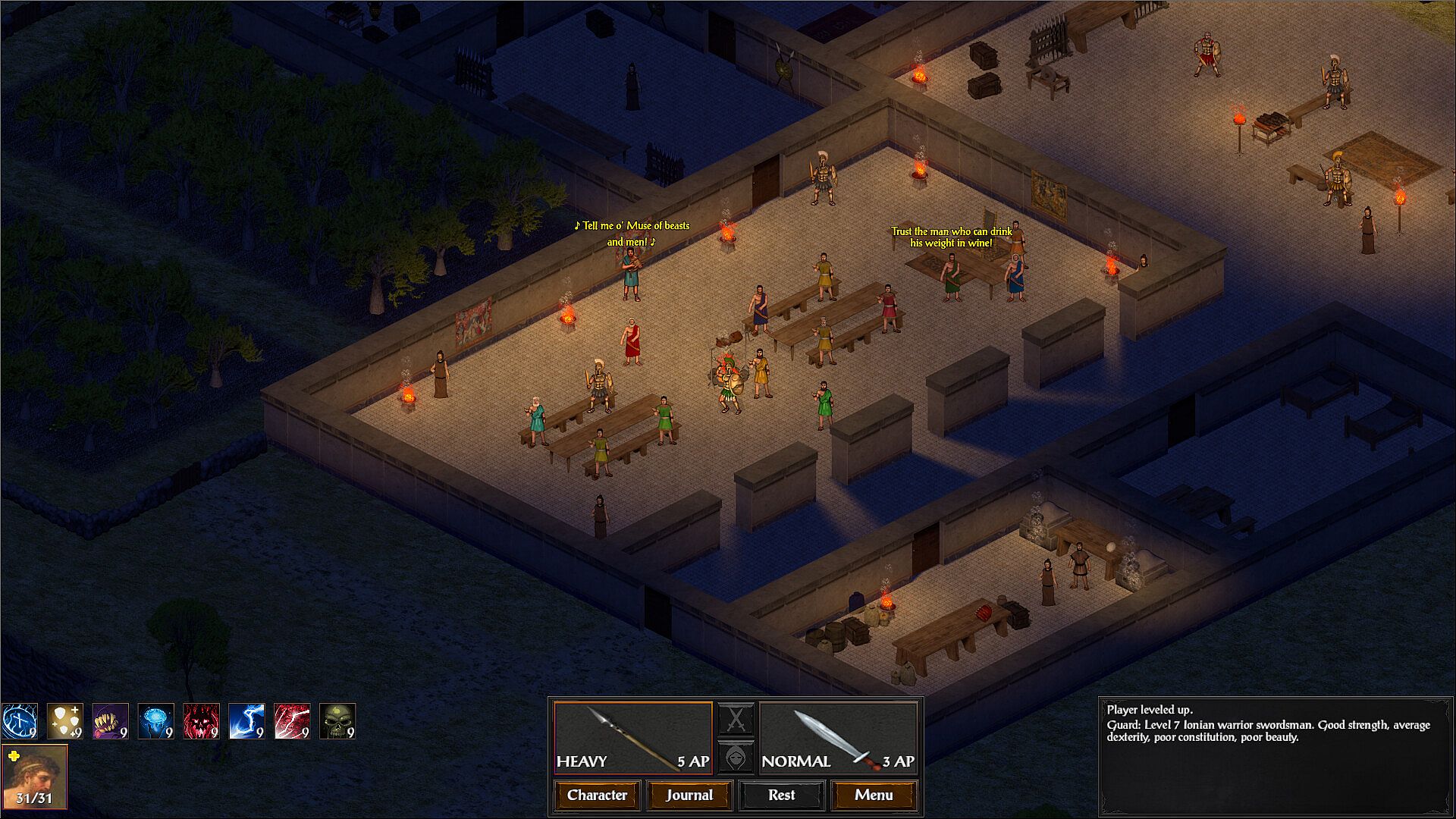 Engaging turn-based combat with an action-point economy. Avoid attacks of opportunity, position your party to outflank your foes, and use blessings from the gods to slaughter them!