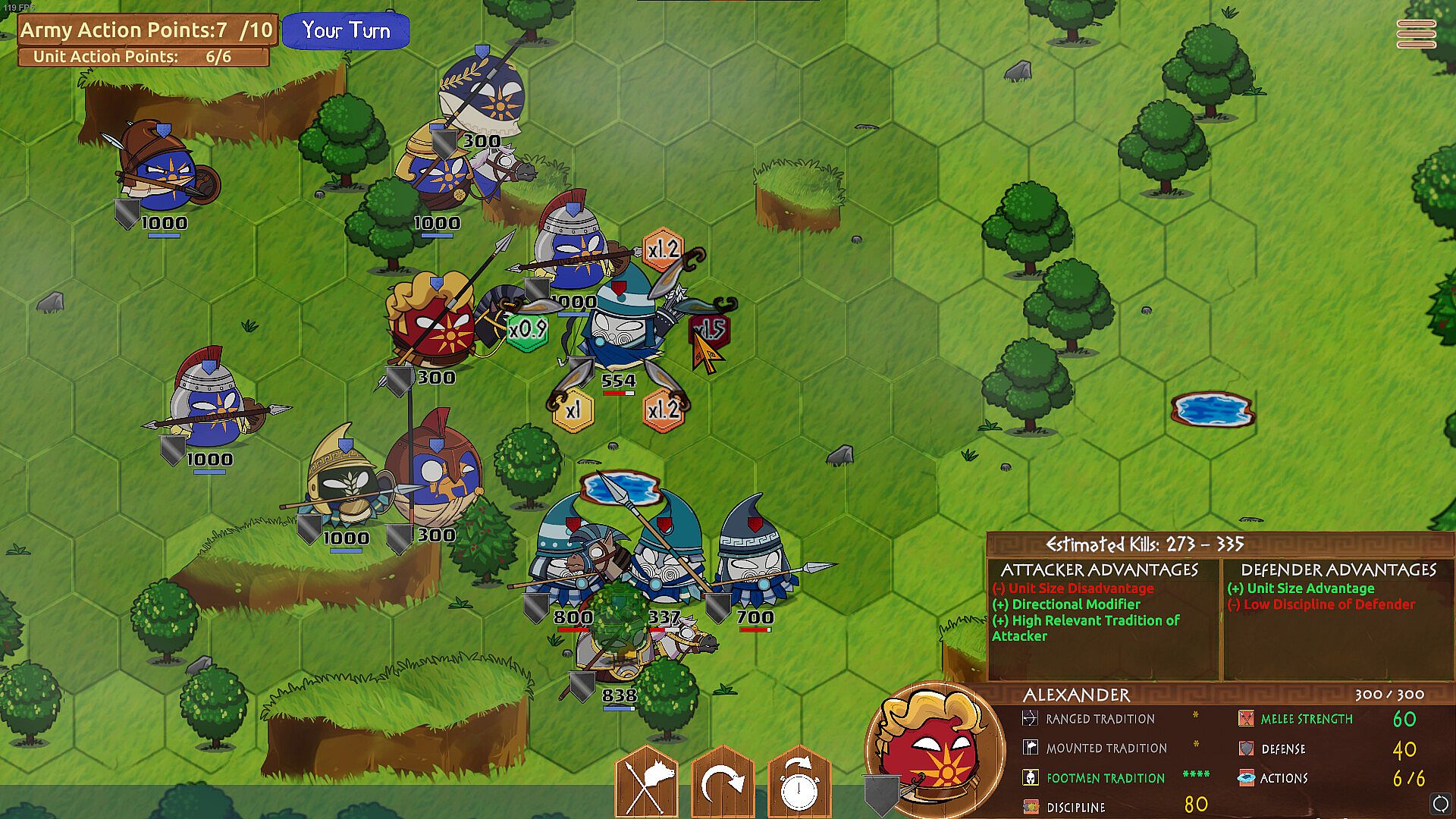 Employ intricate tactics! Outflank your opponents for bonus damage! Instruct your infantry to fortify against attacks! Charge your cavalry into your foes! Keep your ranged units out of trouble and feather your enemies with arrows! Utilize your limited action points in any manner of your choosing each turn to command your army. A infinite range of possibilities await on the battlefield!