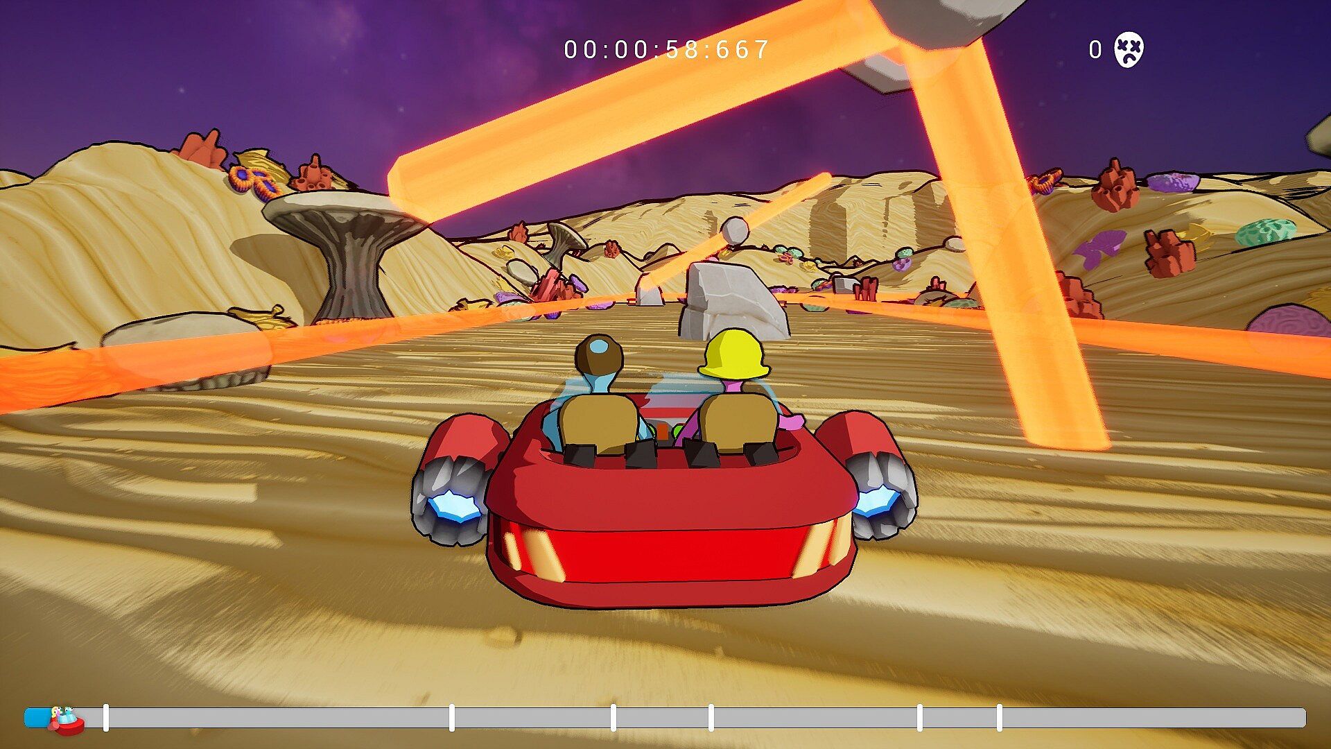 Each of you controls a thruster and must coordinate by alternating between forward, neutral, and reverse to guide your space car through different environments.