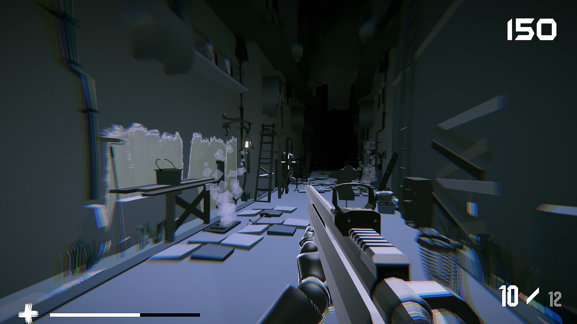 A unique visual style combining heavy contrast, chromatic distortion, and minimalistic shapes to create an unsettling environment.