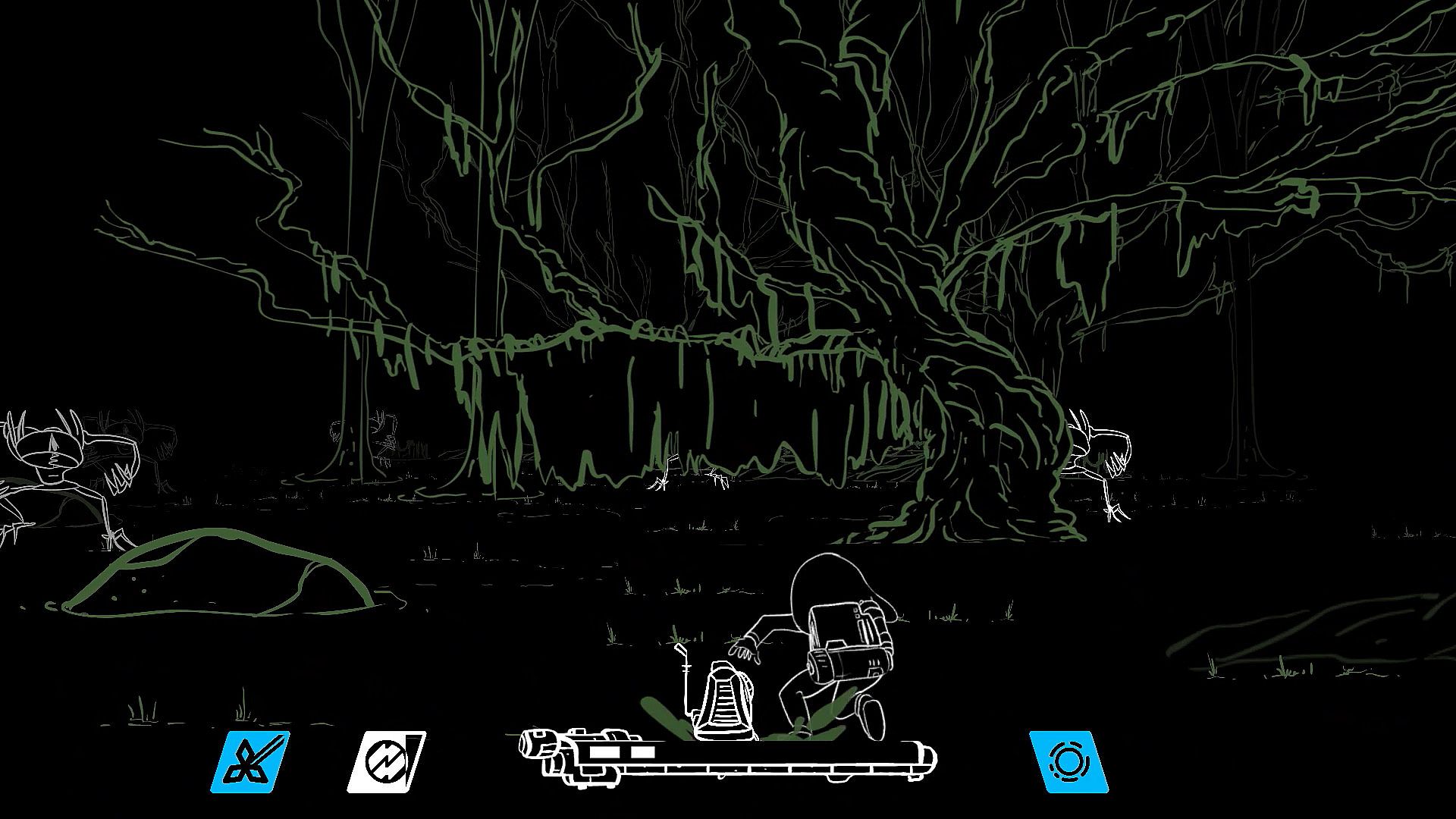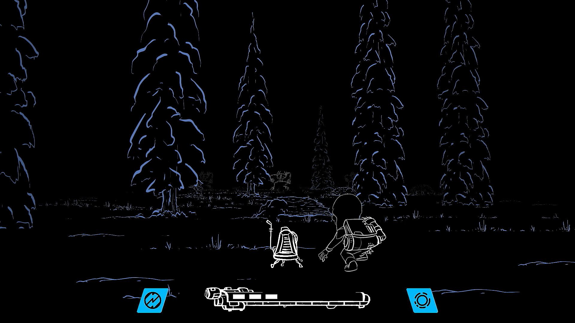 - Backpack menu featuring armament upgrades and selection, alien info, and "lost and found" items