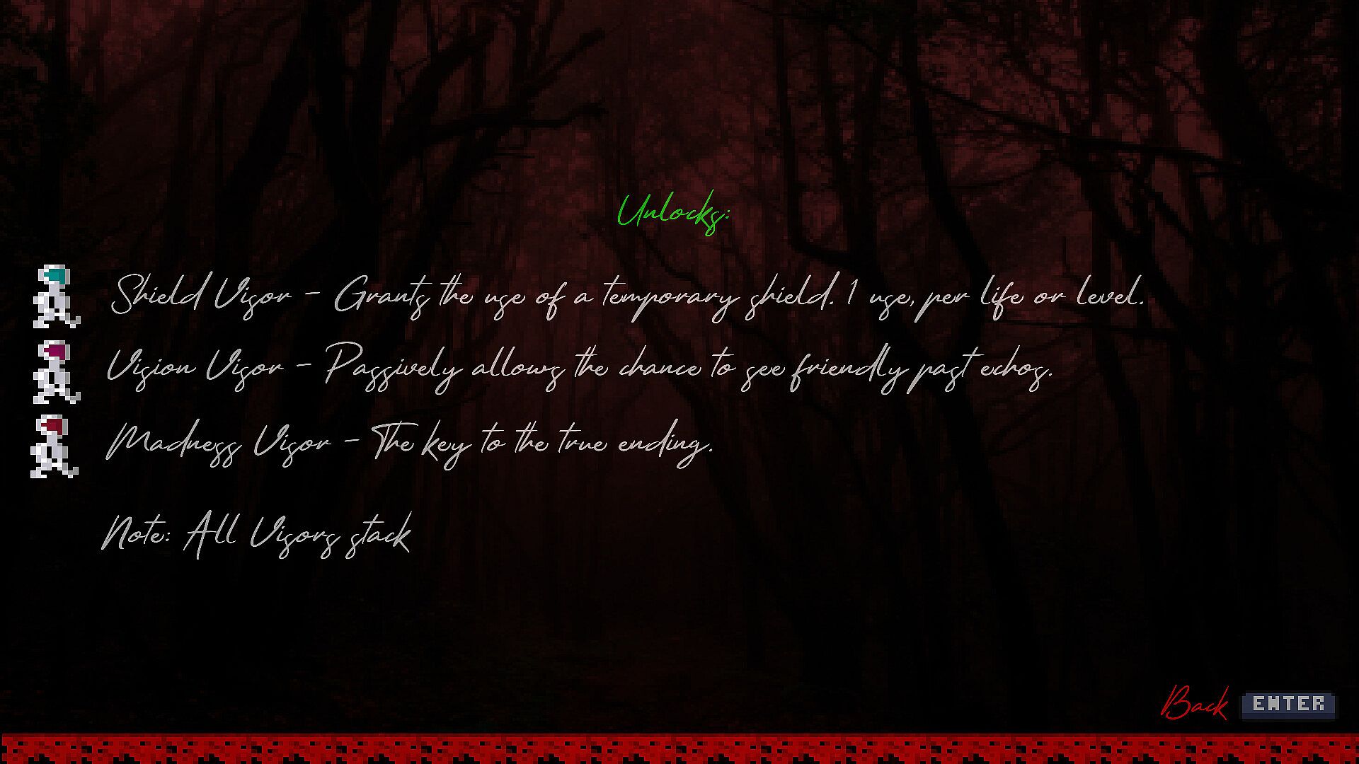 - Three types of visors to unlock. The first will allow you to activate a shield, the second will let you see past echos, and the third will allow you to reach the true ending