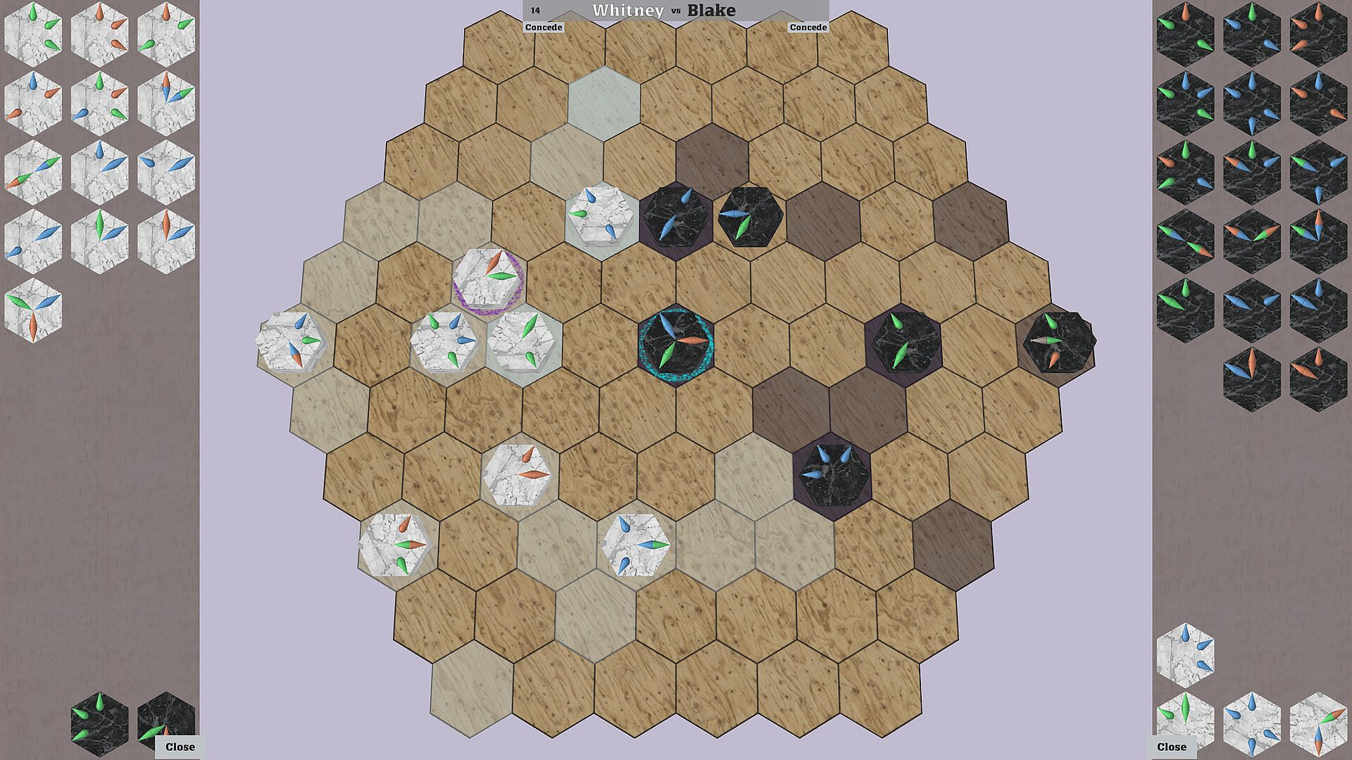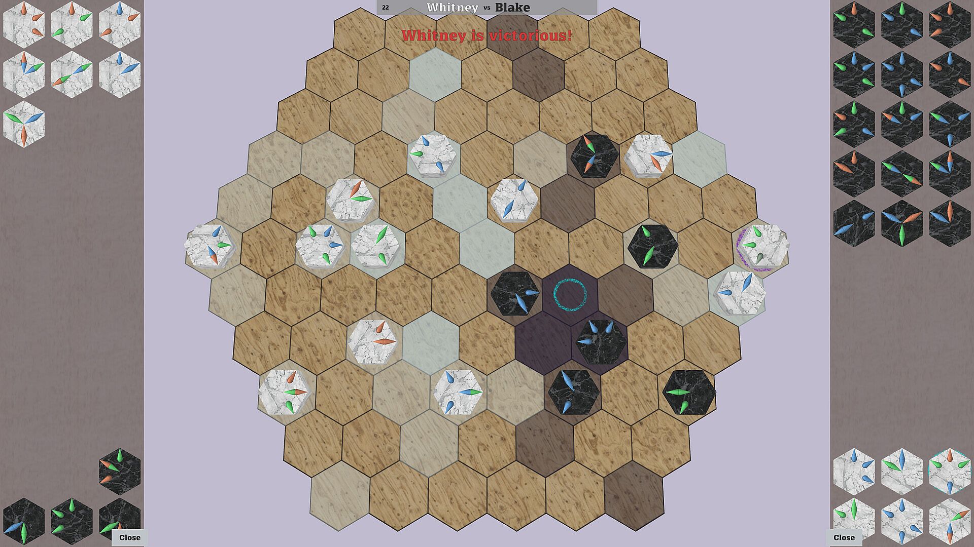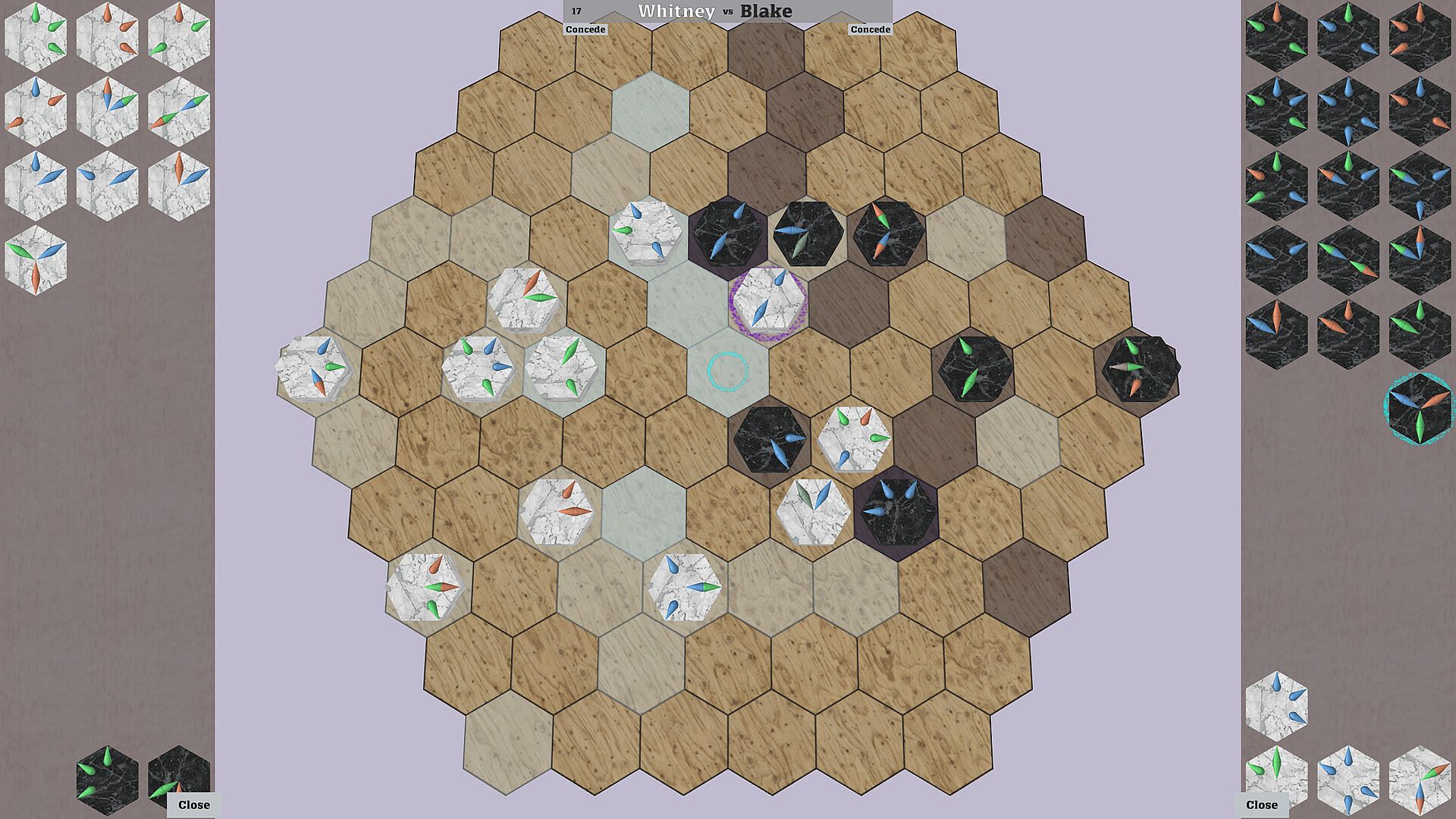 Start by placing your first stone on your base tile, excert influence on surrounding tiles, expand your territory, capture your opponent's stones, disrupt their defences and finally conquer their base tile.