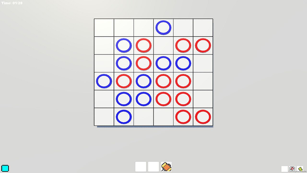 Play a fresh take on tic-tac-toe with a 6x6 grid in this casual PC game. Mouse controls let you place your color and deploy four items to shape the board in your favor. Victory comes from completing a full line with your color while countering your opponent. Hammer wipes out a 3x3 area around your cursor. HandGun clears five spots at random across the board, ShotGun hits three random spots in a 3x3 radius, and WildCard flips a chosen cell to your color. Casual players who enjoy strategic tweaks to classic rules will find quick, replayable matches here.