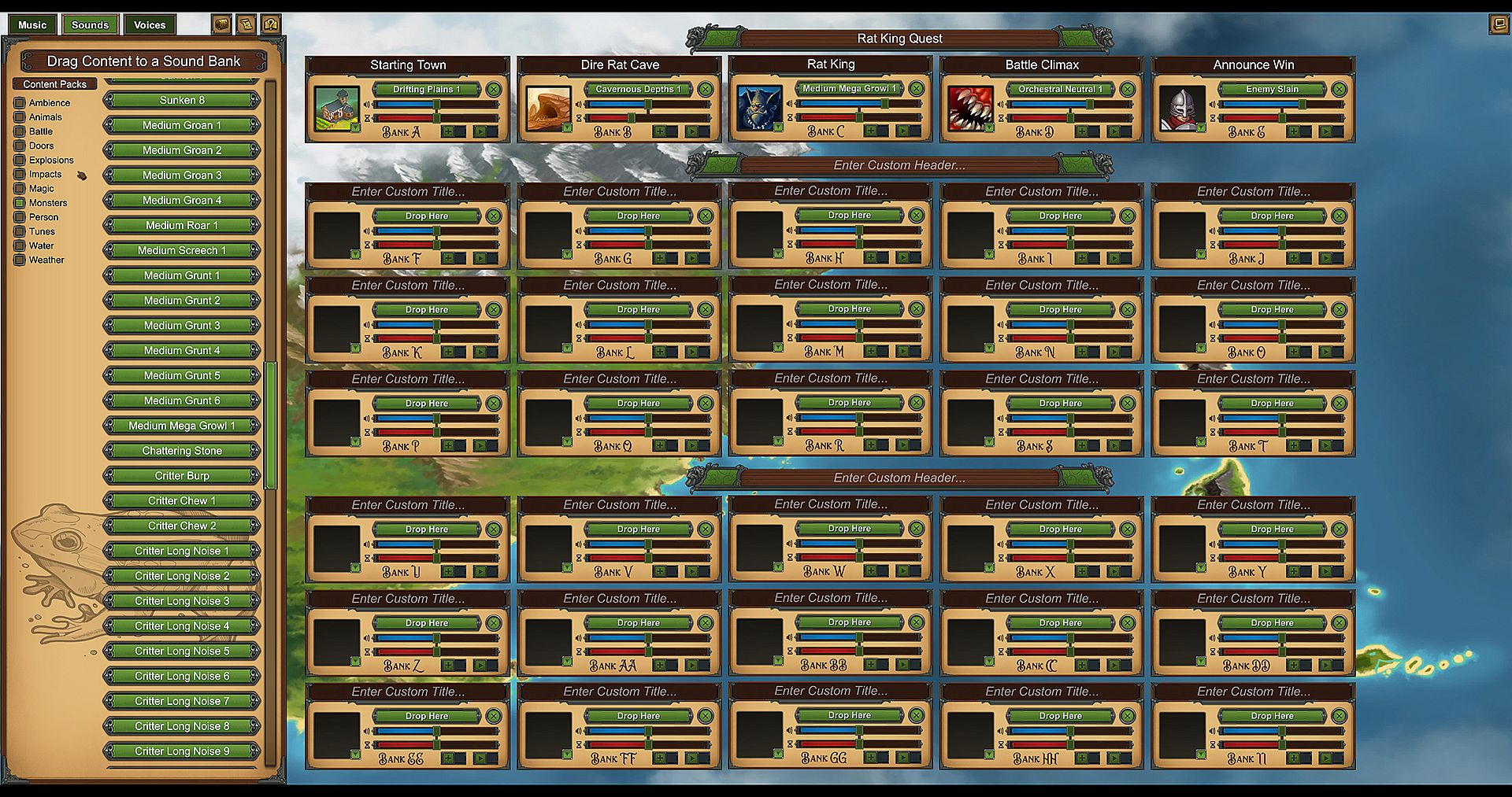 Change the pitch to make the sound element suit your needs. Build entire sound boards that you can save and load for future use. Play multiple sound banks at once to make the perfect atmosphere for your setting.