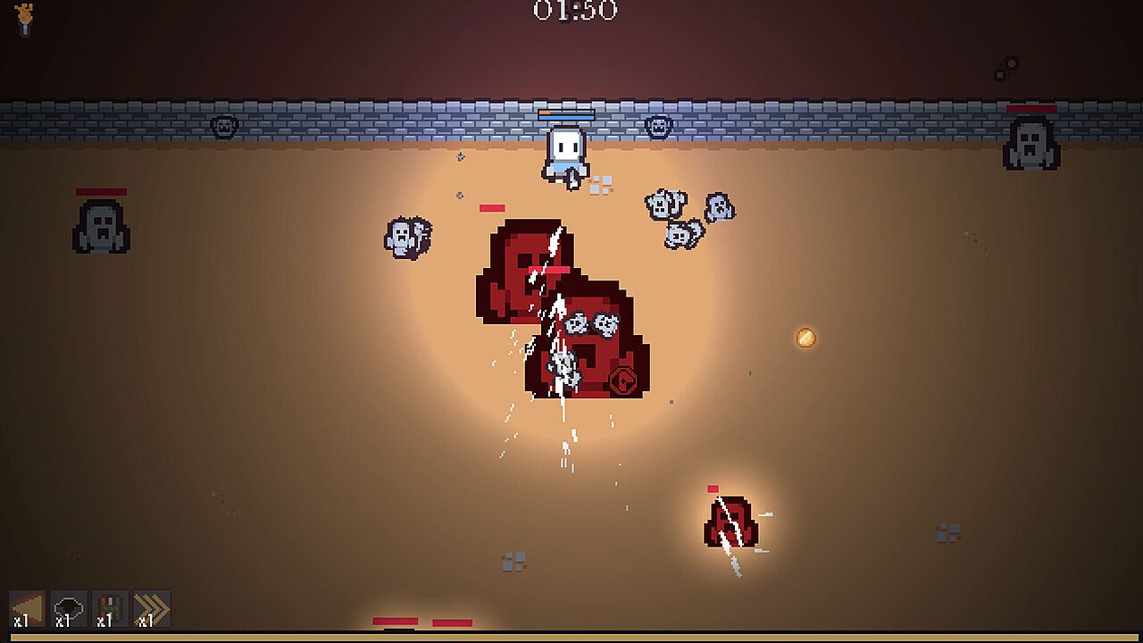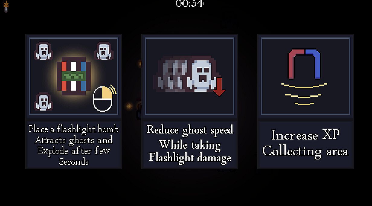 You will remotely control a robot to explore the underground world, full of ghost monsters, they are afraid of light, your flashlight can do damage to them, the mouse control the direction of the flashlight, Keyboard 'WASD' controls the direction, has 3 lives per turn, will be hit by the ghost will be damaged, after killing the ghost will drop experience, when the experience slot is full, will pop up random 3 skills for you to choose