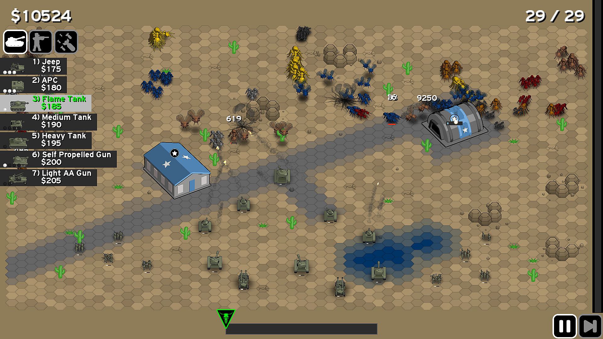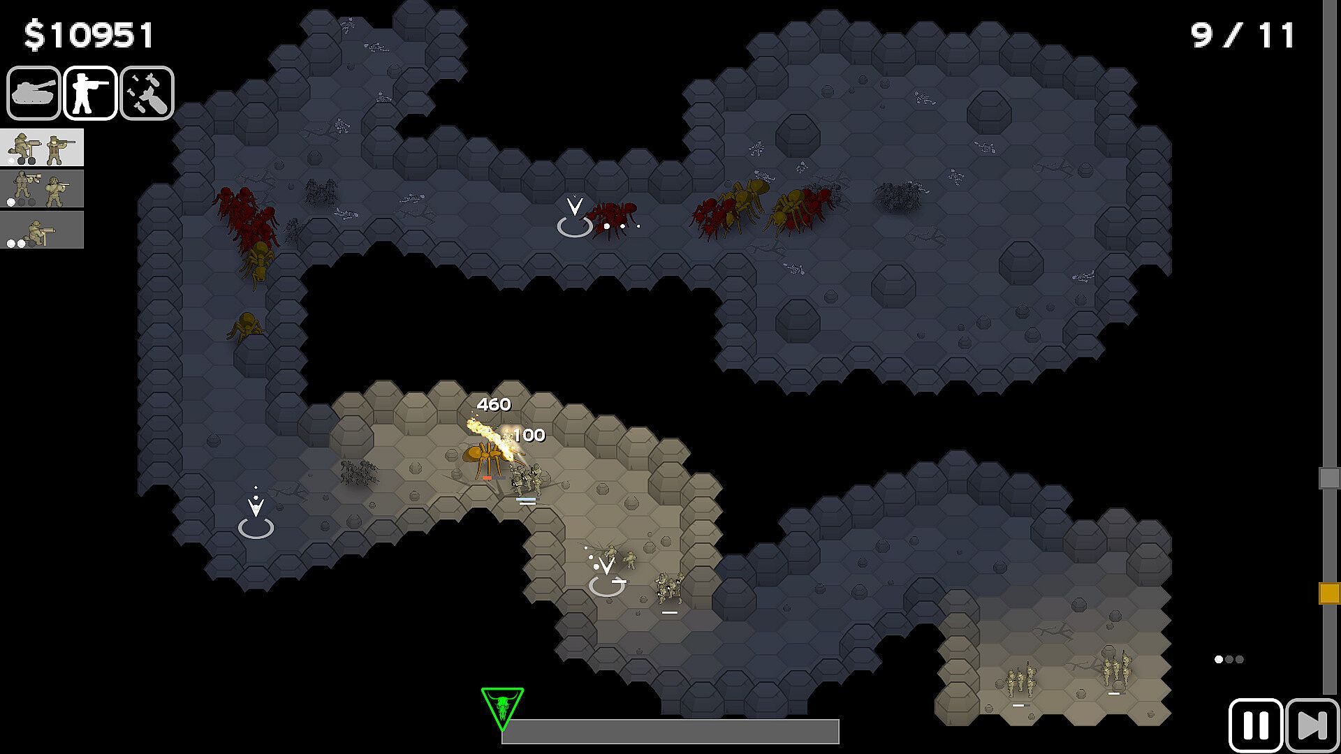 Face diverse ant types, each with unique behaviors and challenges, from workers targeting structures to soldier ants attacking your units. As the game progresses, new threats like winged drones, hunters, and colossal queens emerge, culminating in high-stakes encounters where the fate of humanity hangs in the balance.