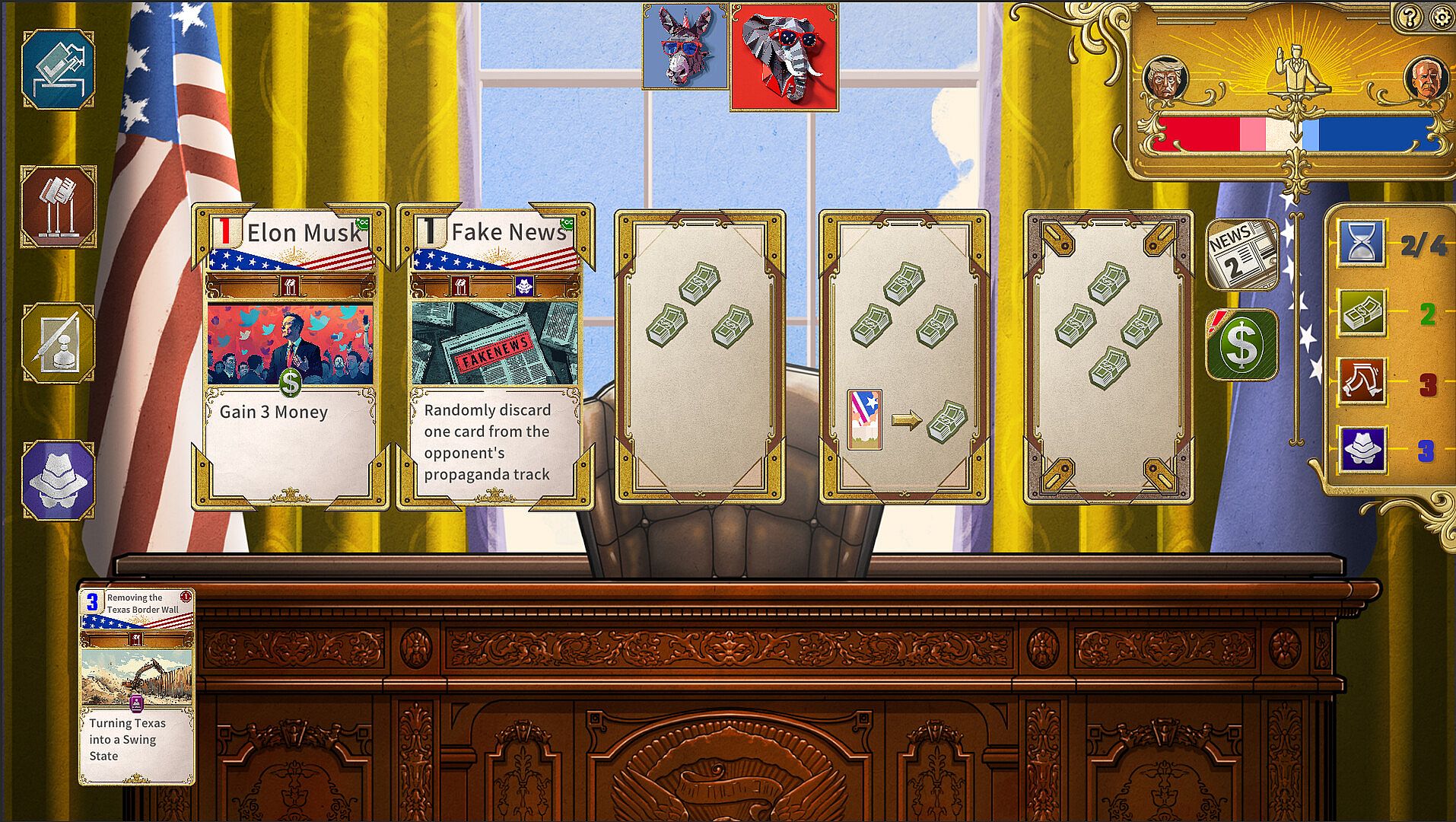 Choose to play as Trump or Biden and join the 2024 U.S. presidential election. Use cards to control swing states and secure electoral votes—once you exceed 270 votes, you win the election. You can simply allocate a card’s points to a state, or you can activate the card’s special effects.