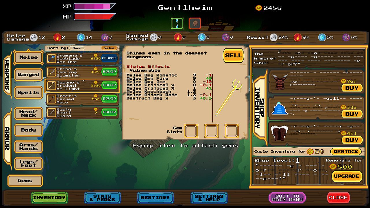 Gentlheim has shops to buy and sell goods; an Inn to heal up, level up, and stash gold to retrieve after death; and a deep Well leading to randomly generated procedural levels. There are various structures you can pay to upgrade and, as language returns to the village, townsfolk who may need something... Gentlheim hides a few surprises for the inquisitive gamer and provides a hub area to approach different stages in any order you like, or revisit levels you’ve already beaten.