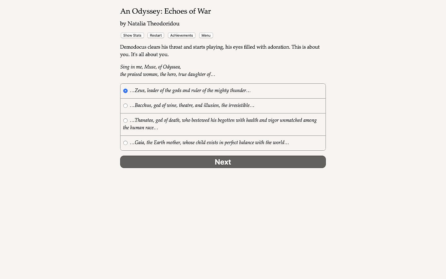 An Odyssey: Echoes of War is an interactive retelling of Homer's The Odyssey by Natalia Theodoridou, where your choices control the story. It's entirely text-based—250,000 words, without graphics or sound effects—and fueled by the vast, unstoppable power of your imagination.