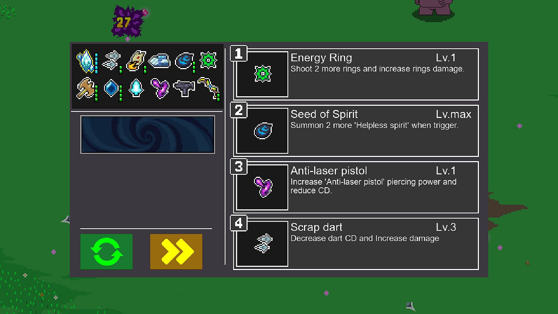 Killing an enemy will automatically gain EXP. Gain enough EXP. will level up. You can pick 1 upgrade out of 4 options when you level up. If you have specific upgrades, you can fuse them into a more powerful upgrade in the level-up screen.