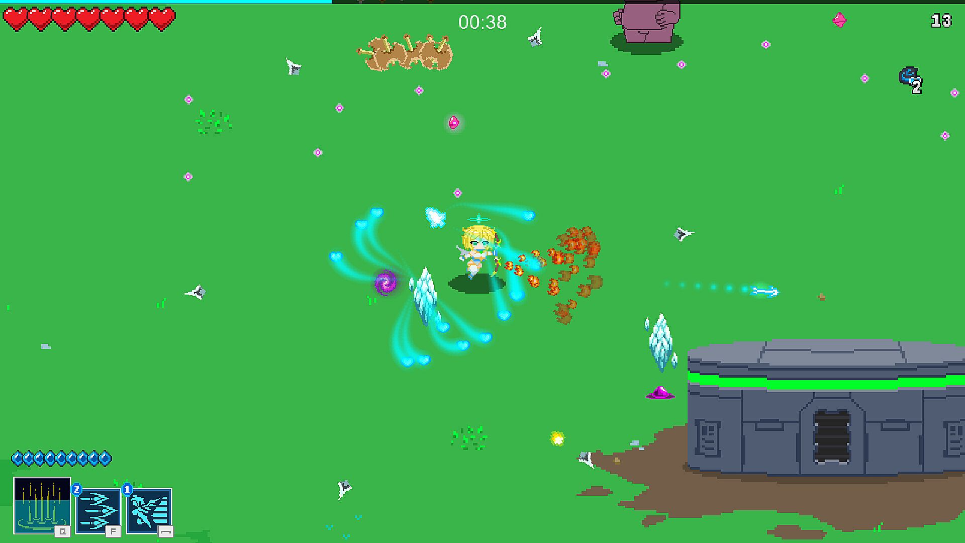 Angel Emica is a survivor-like game, with an additional goal of protecting a tower in a fixed arena.