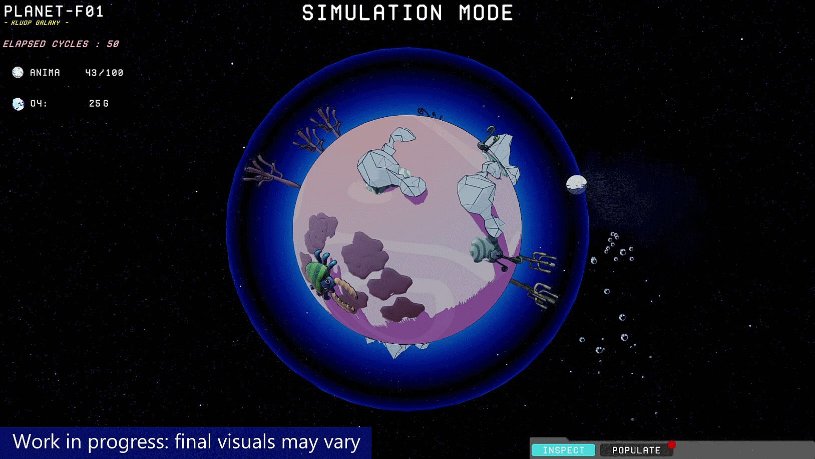 In Anima mundi, a species is considered discovered when it manages to survive for a certain number of days on a planet. To achieve this, the player will need to use two complementary game modes, each designed in a minimalist way: Simulation Mode and Control Mode.