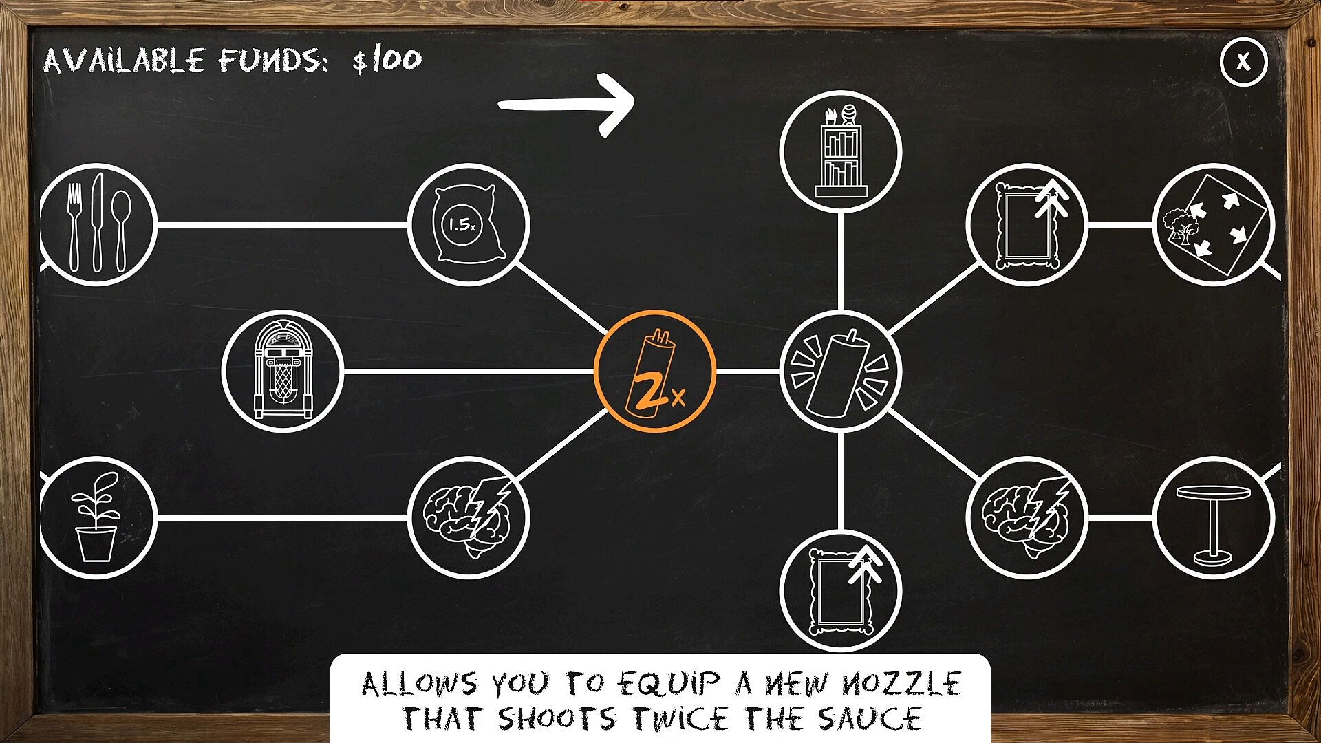 Earn money to upgrade your sauce bottles and kegs. Progress though the perk board to unlock all the sauces, as well as some fun extras! Decorate the shop. Print memes. Use the arcade machine to re-sauce any object you have encountered.