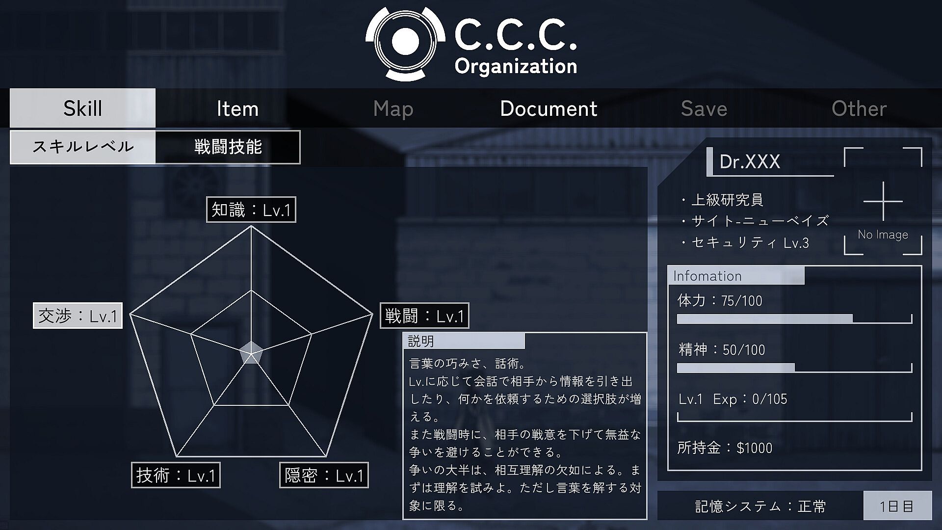 Investigations sometimes require skills such as "knowledge," "negotiation," and "combat." Depending on the level of your skills, the information you obtain, relationships with other characters, and even the story's outcome may change.