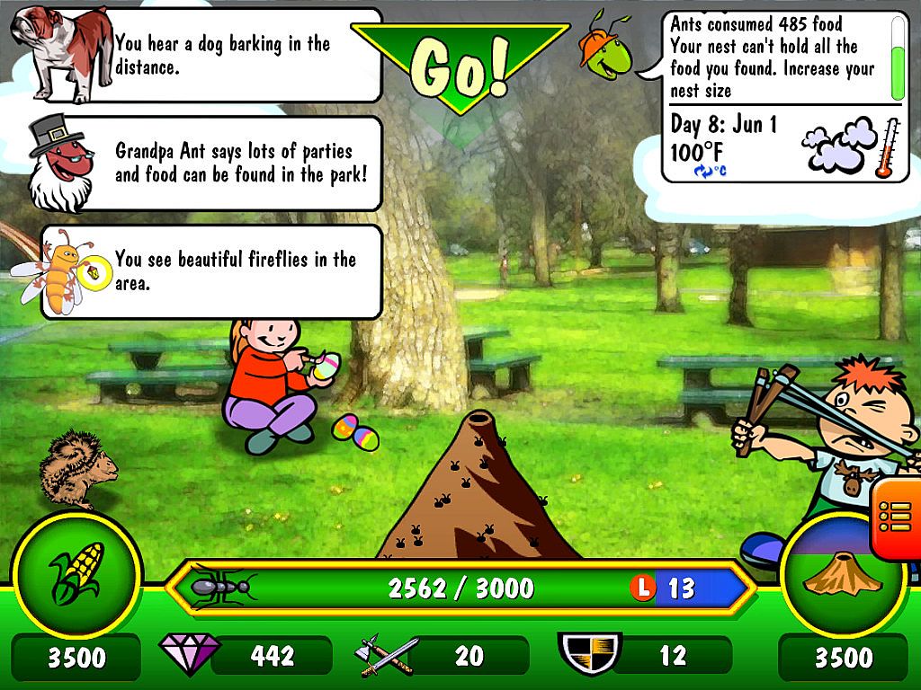 Emerge from the ant hill with a handful of ants and a dream... to conquer the world. Train your ants with new skills, manage their daily work load, and travel across the town in search of new land. Sharpen your pincers and be ready for a fight because everyone from beetles and slugs, to the town police and the army will try to stop your ant colony!