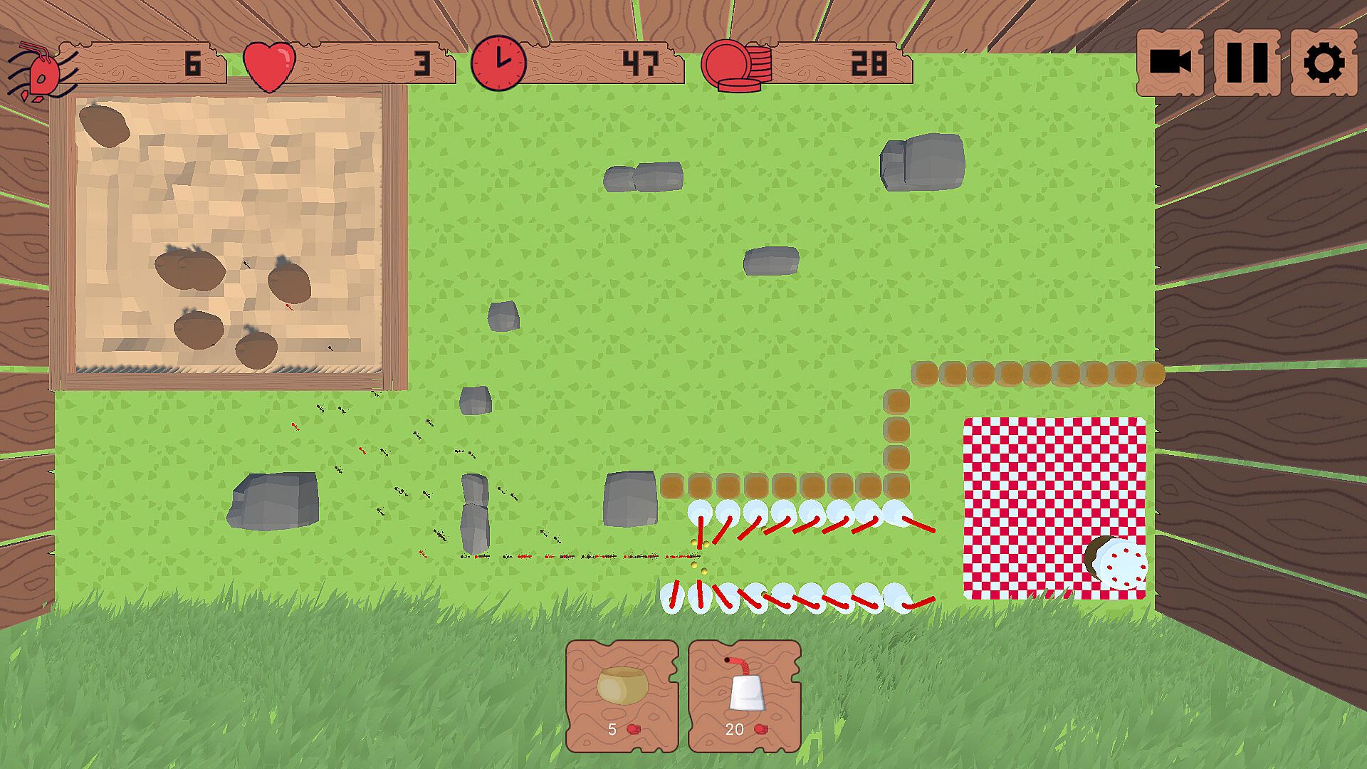 • Ants: These pesky enemies are determined to raid your picnic set! They’ll follow the shortest path to the cake unless distracted by baits or blocked entirely. If their path is fully obstructed, they’ll relentlessly destroy anything in their way to forge a new route.