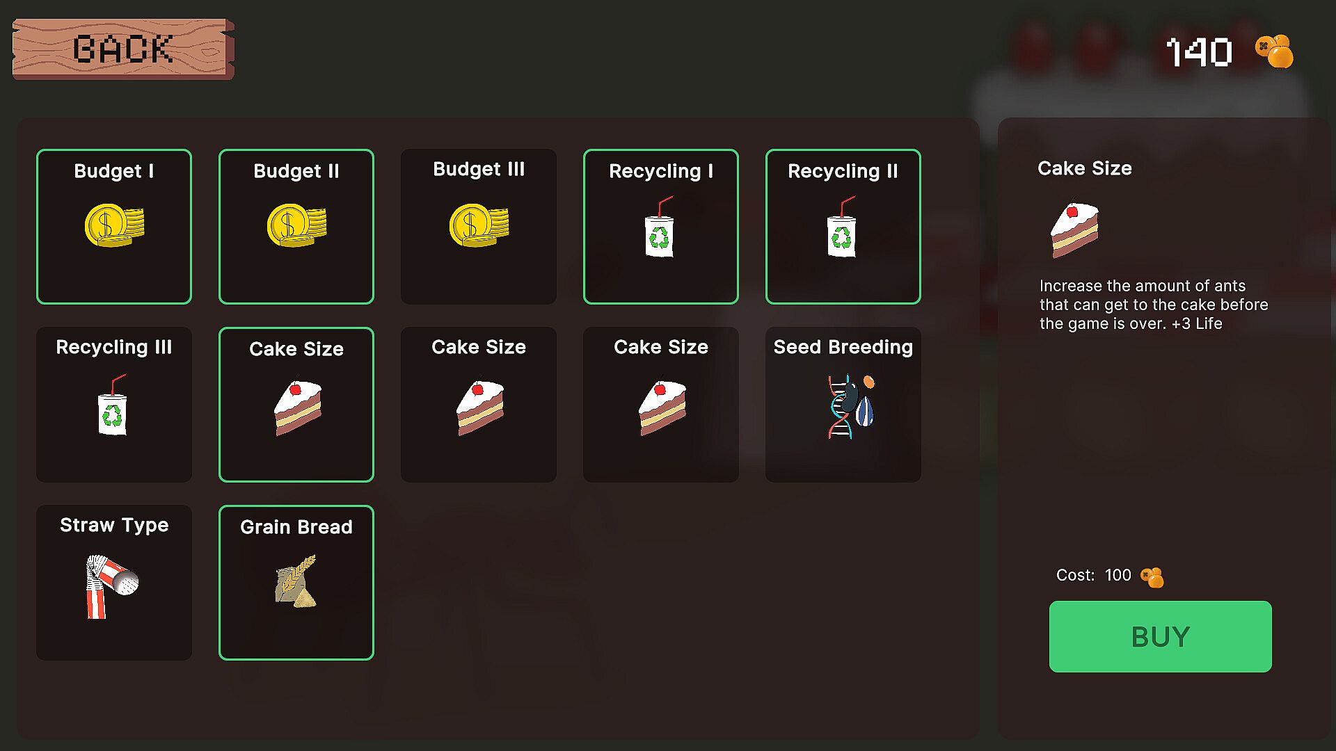 • Towers: Your primary defense against the ants. Towers shoot seeds and can be upgraded to use different types of seeds with unique properties. For example, strawberry seeds are small and fast, while watermelon seeds are large and can hit multiple ants at once.
