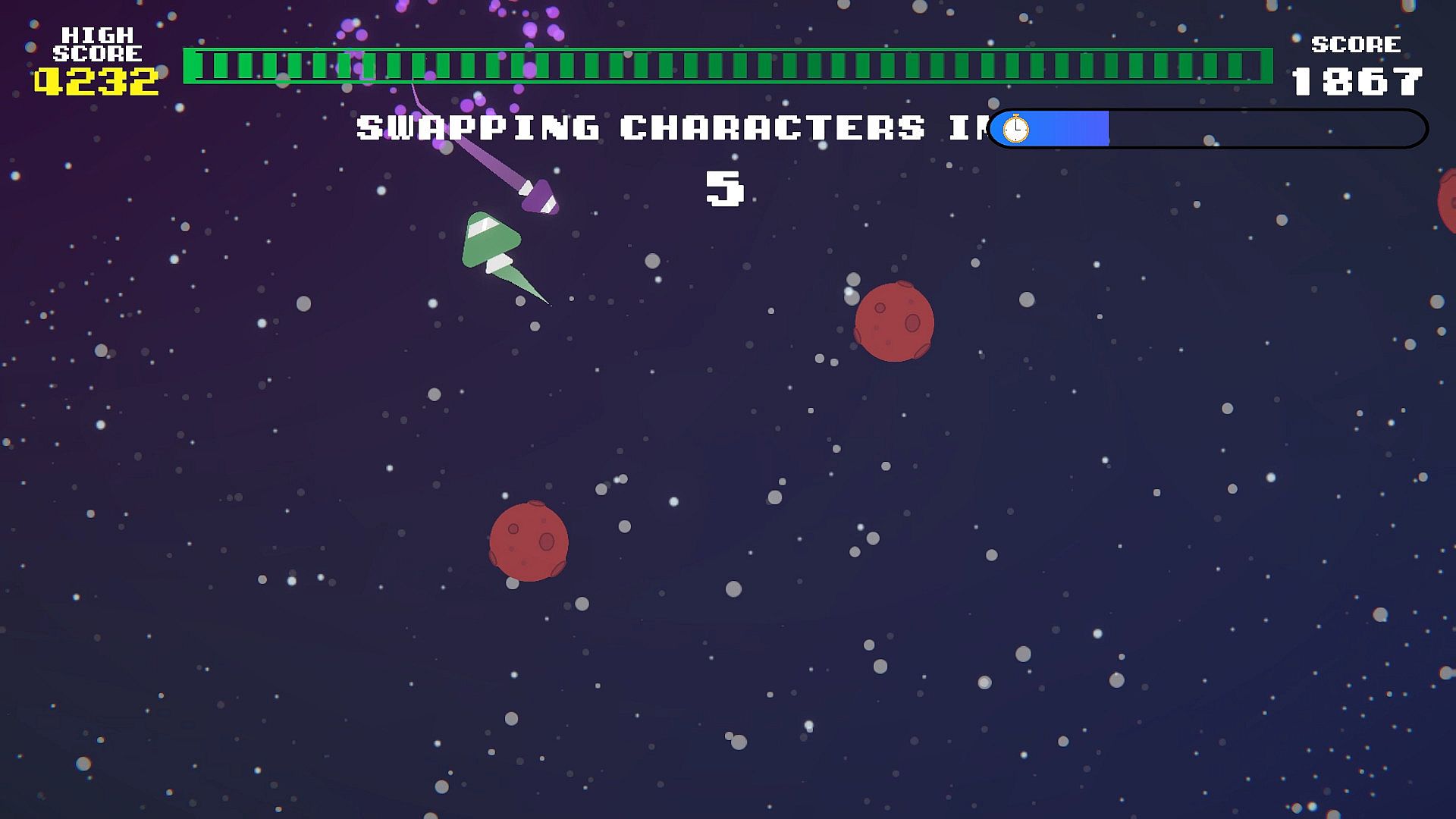 • Control a Purple Ship which gives the Green Ship health back upon destroying asteroids, but cannot die or pick up powerups.