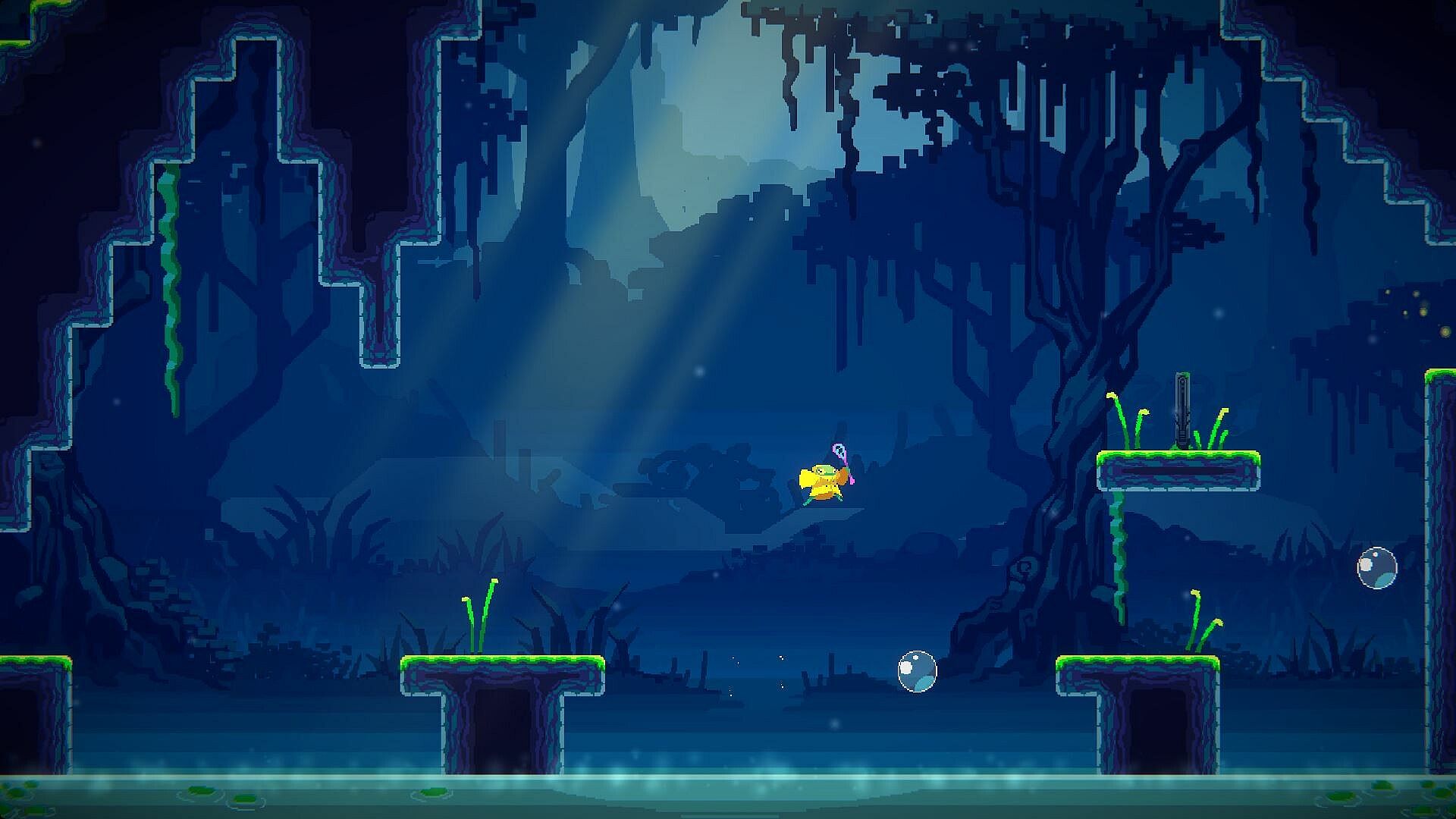 In “Anura” you are Don Rano, a frog with the mission to cross the swamp  jumping from platform to platform, dodging obstacles and using bubbles to propel himself as far as possible. Thanks to his bubble-blower, you will be able to create bubbles that will help you get to places you didn't think you would be able to reach