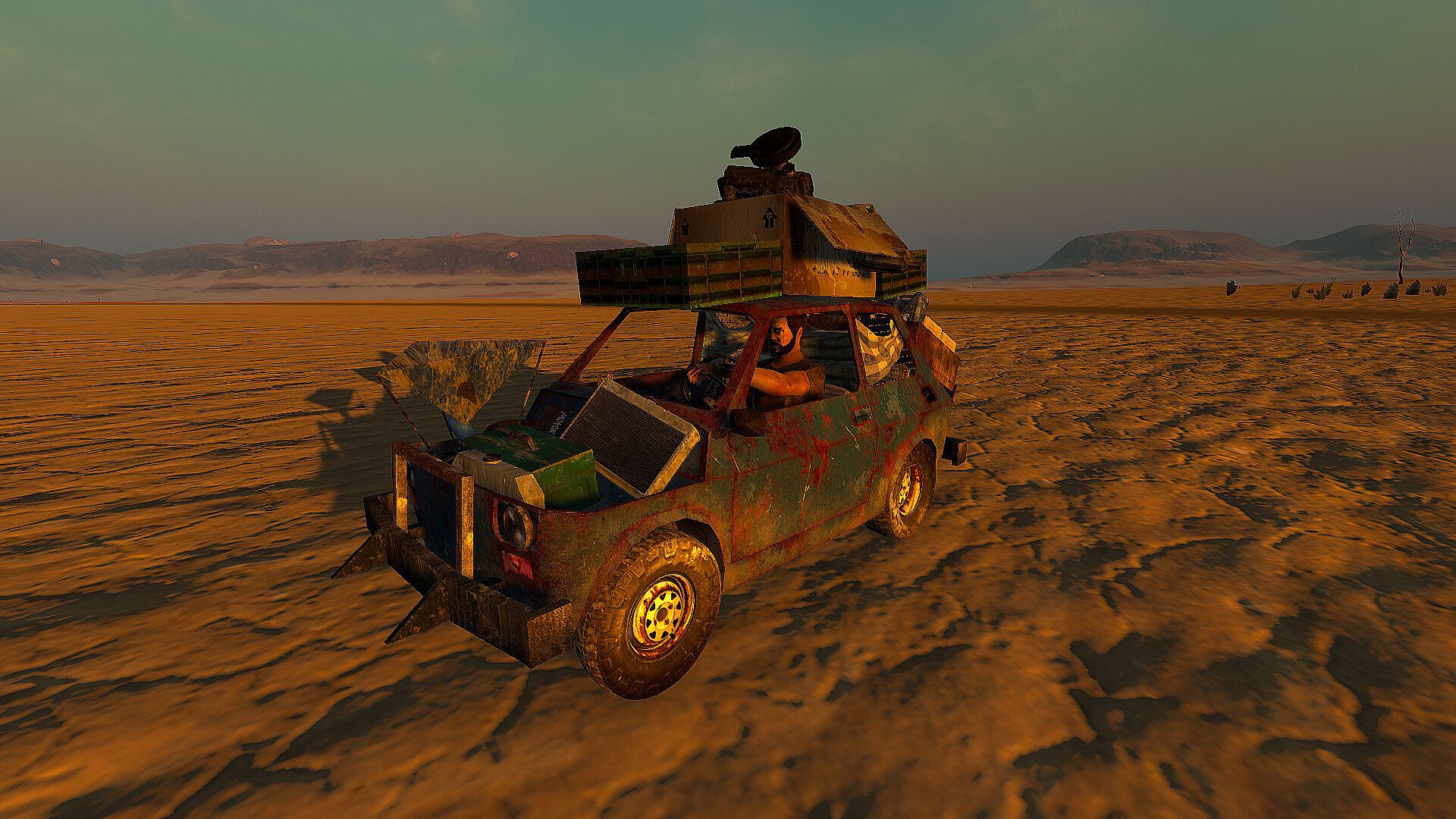 Eat the bugs, dogfood and mystery meats. Make you car into a moving base, by using portable maggot farms, dew collectors, weed and tobacco plants. Butcher animals, mutants and cook their meat.