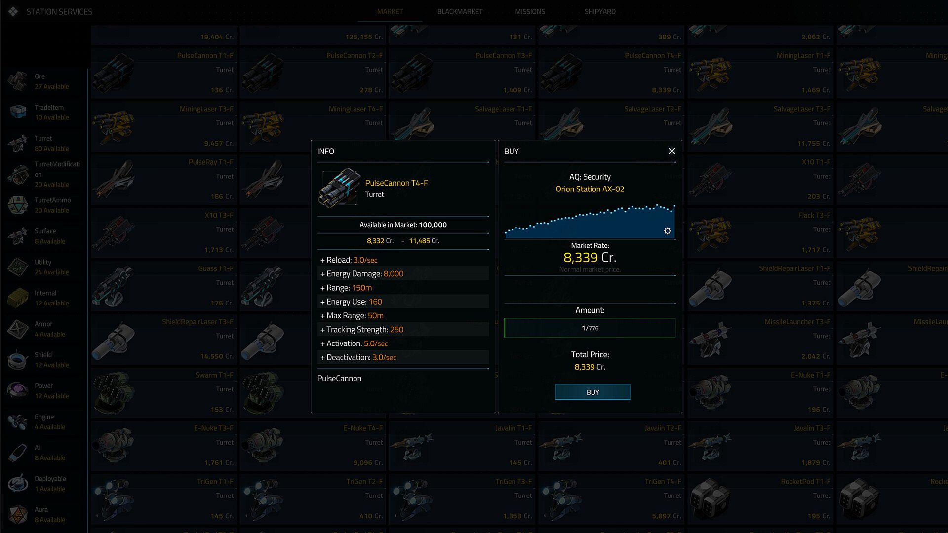 The Aquila system has two markets, the main market provided by AQSEC and TITAN where players can buy and sells all kinds of goods, you can even make a profit shipping goods between sectors based on real time demands ( Have the corporations not built enough orbital farms, then ship some food! )