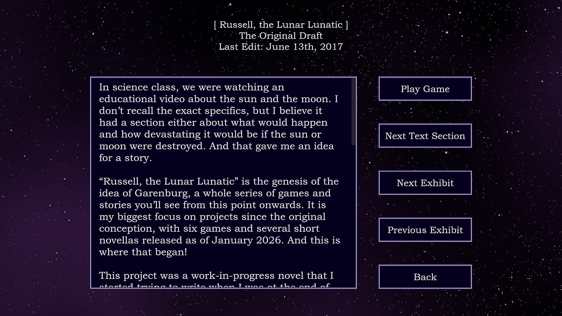 Want to know what goes into making a game? Included with the collection is a museum tour giving developer commentary, context and background to all these games, with a retrospective years later on the process of making them. Insight into the development of games released separately from this collection, such as Garenburg Woods, Garenburg Penitence: The Riflebird, and bygone snow, is also included. And to top it off are a bunch of concept art, info on scrapped ideas and prototypes for various other projects over the years!