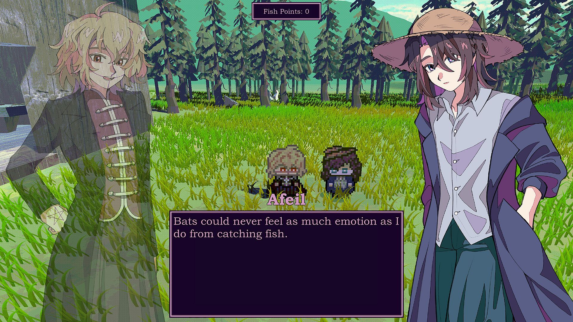 After a young and mysterious girl named Castranom arrives at a small hut near a lake occupied by recluse Afeil, the two begin a friendship and find solace in each other. As Castranom learns to fish at the lake, watch as the two grow closer and their own past come to light in a short little fishing game.