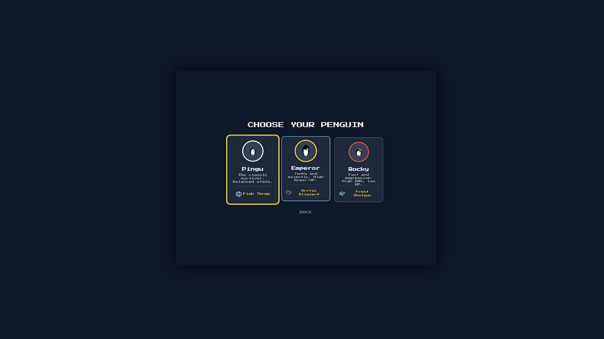 Permanent Growth: Every run earns you Gold. Spend it in the main menu to permanently upgrade your Penguinβs stats. Increase your speed, base health, and pickup radius to push further into the frozen wasteland.