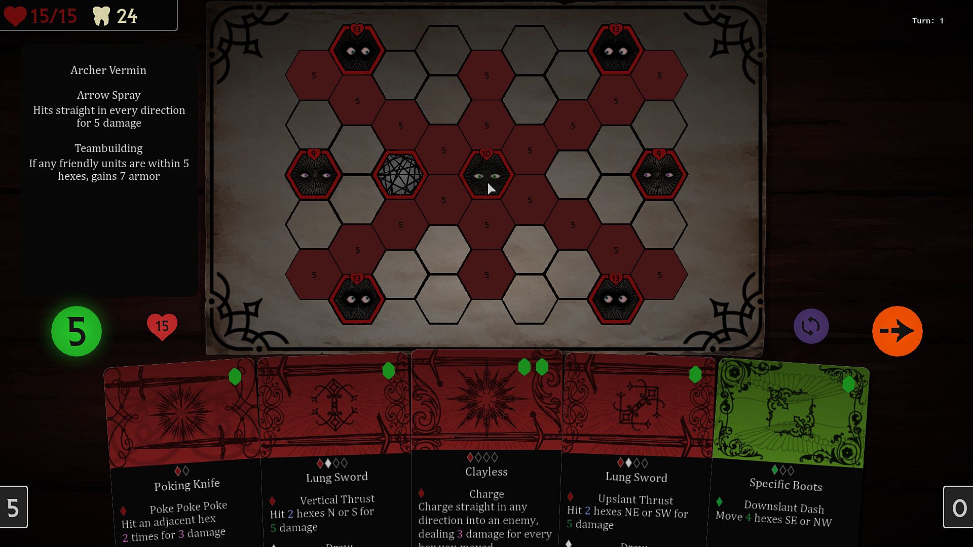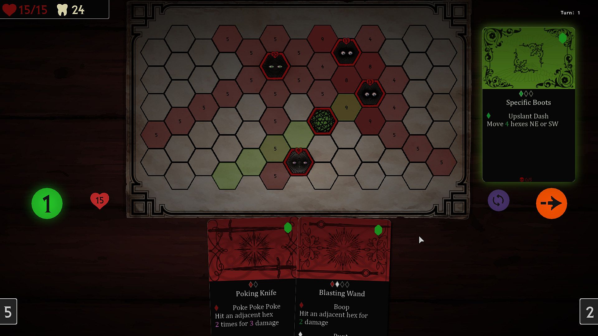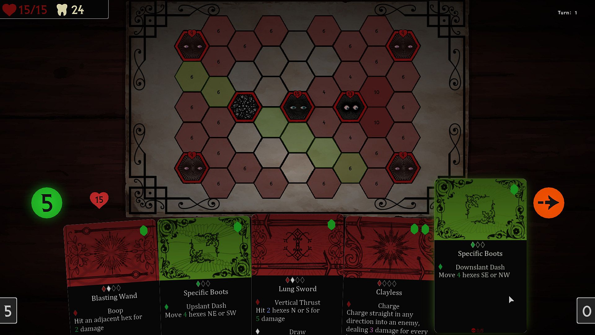 Slice and dodge your way through a hex grid in this puzzle tactics card game. Avoid danger while dealing damage with the cards on hand, while powering up your deck.