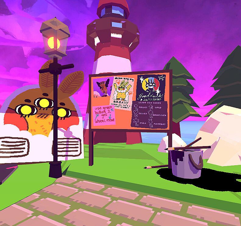 Meet GoodLuck [she/her] , MothBot [he/him] Jester [he/they], Rhea [they/she], and a few more eclectic and unusual creatures who look after the island, which takes the shape as a little amusement park!