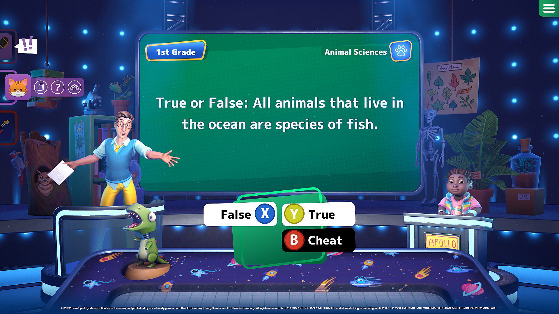 Are You Smarter Than A 5th Grader? is a charmingly humorous quiz game based on the popular TV franchise. Multiple-choice questions, true-or-false challenges, and minigames will test your proficiency in 24 different subjects. Faced with a tough question, you can always rely on your classmates for help. More than 6800 questions on topics like animal sciences, vocabulary, math, and more are delivered by a diverse, fully voiced, and animated cast of characters. Beat each challenge alone or together with family and friends in exciting couch co-op multiplayer gameplay to prove that you are, in fact, smarter than a 5th grader!