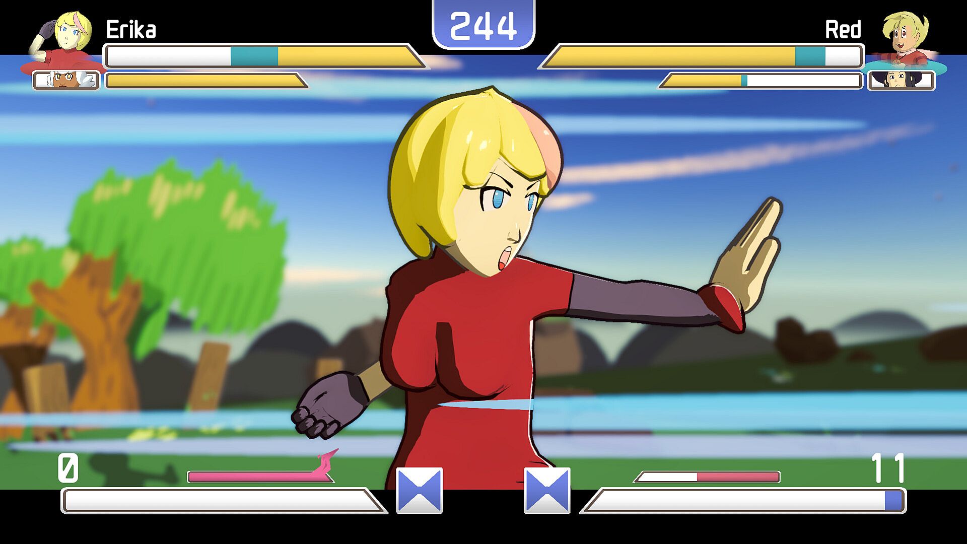 Select and Battle with a team chosen from six unique characters, each designed to suit a different archetype of play, such as Striker or Zoner. Learn the ins and outs your favorite characters' moveset and characteristics to find a way to victory!