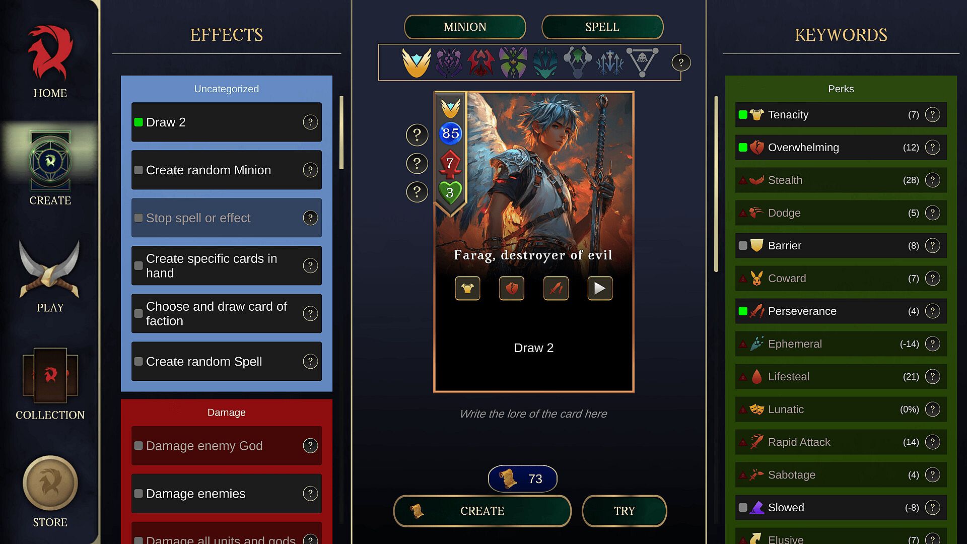 With the in-game Cards Editor, you can combine the effects and keywords of 8 different Factions to create balanced cards that make your deck, and strategy, truly unique.