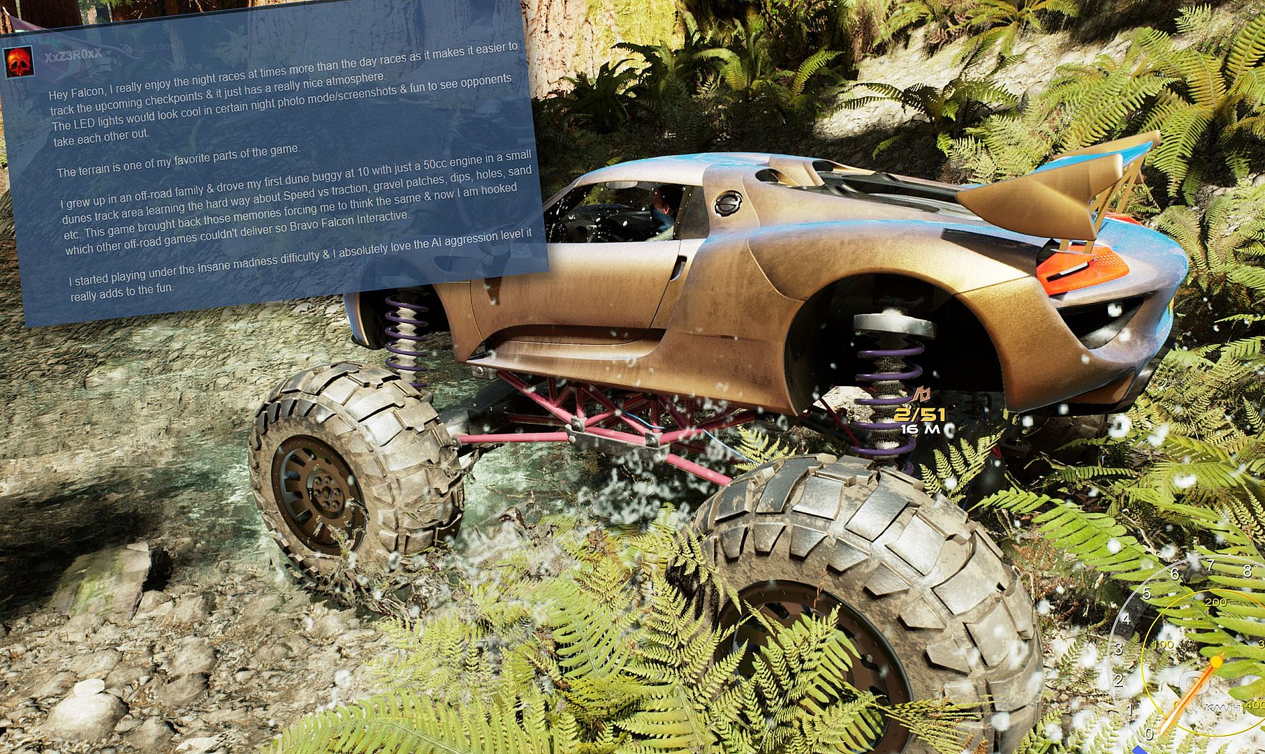 I grew up in an off-road family & drove my first dune buggy at 10 with just a 50cc engine in a small dunes track area learning the hard way about Speed vs traction, gravel patches, dips, holes, sand, etc. This game brought back those memories forcing me to think the same & now I am hooked on which other off-road games couldn't deliver so Bravo Falcon Interactive.