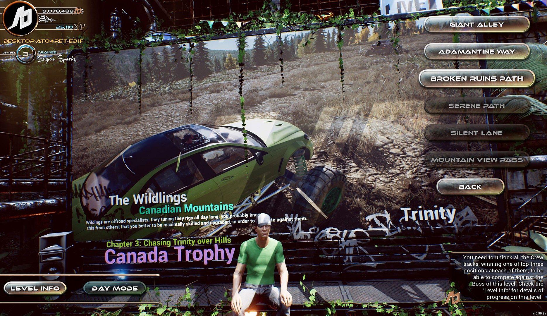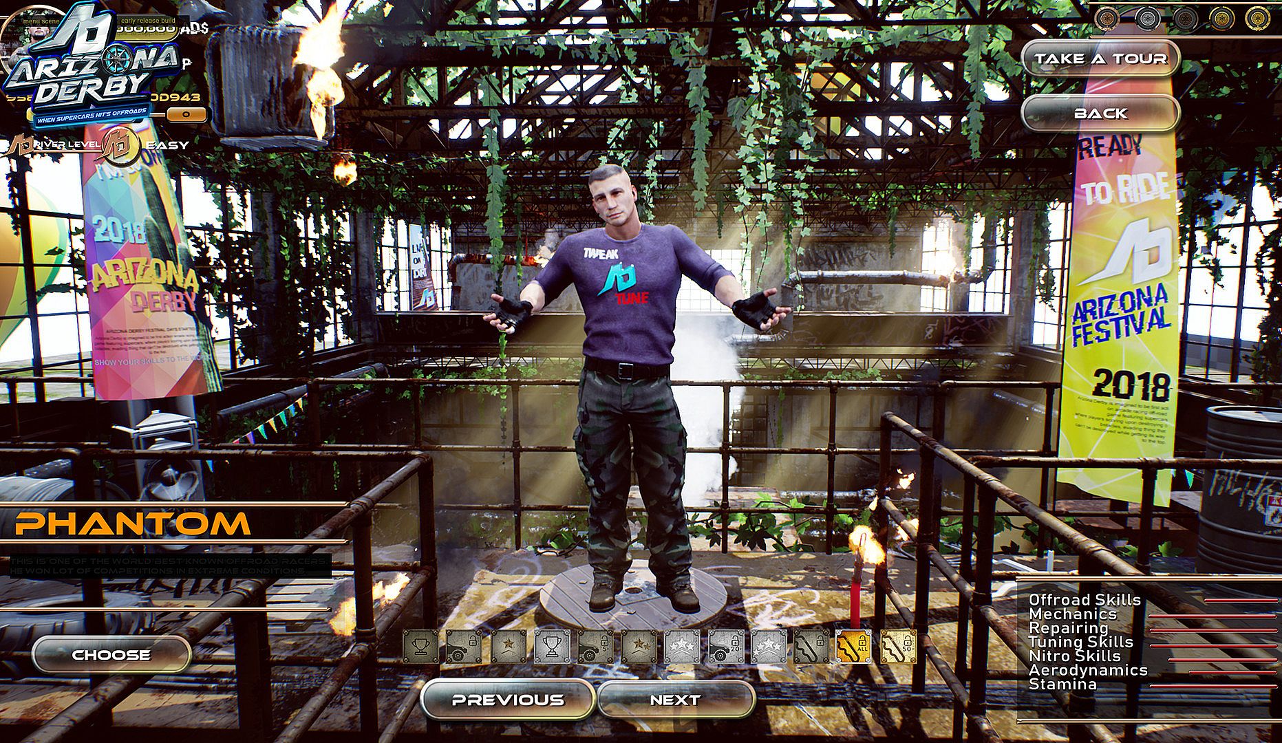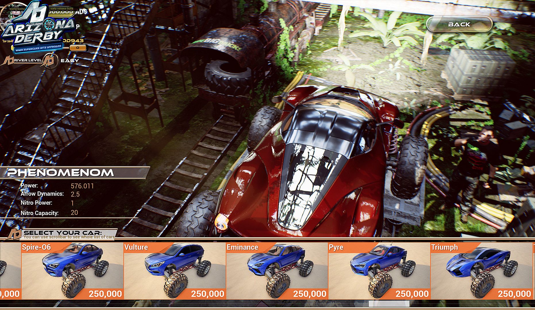 At hero selection stand, you can choose ADriver that fits your driving style best; it will represent you all over races. However, you may have few drivers to race for you, here you can select them and upgrade their abilities. Each of them has a unique set of skills that will help you in the most insane off-road racings ever.
