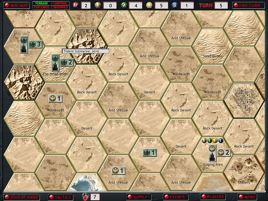 The game map is created randomly each time you play and seeded with resources and independent units and facilities. Your cards are played by drawing on your resource stockpiles. 4 basic resources are necessary to build your empire in the harsh new world. Humans, Materials, Energy and Technology are all strewn across the playing board. Some are concentrated in the ruins of human cities; others are found in the junk heaps of forgotten battlefields or simply lying buried in the vast wastes.