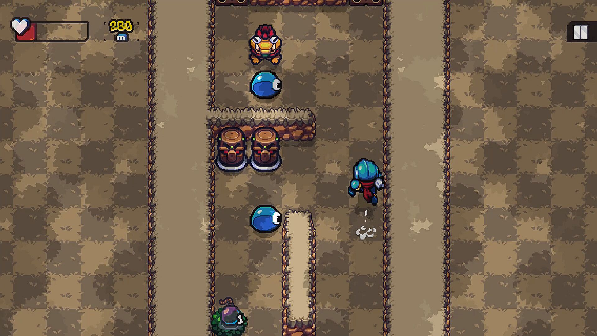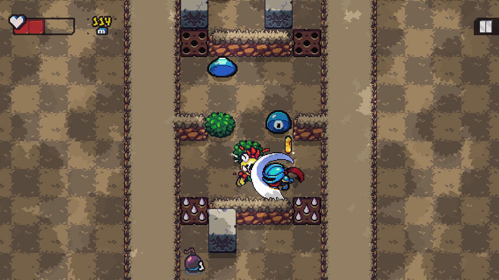 Sir Stepsalot finds himself trapped in the Cursed Forest! Luckily, he has his trusty sword and bomb pouch to fend off dangerous monsters. He will have to travel deeper into the forest fighting monsters and avoiding traps. He may find treasure along the way to sell to the shopkeeper. Our knight can't stay in place for too long though. There's a dark curse following him! It's probably best to stay away.