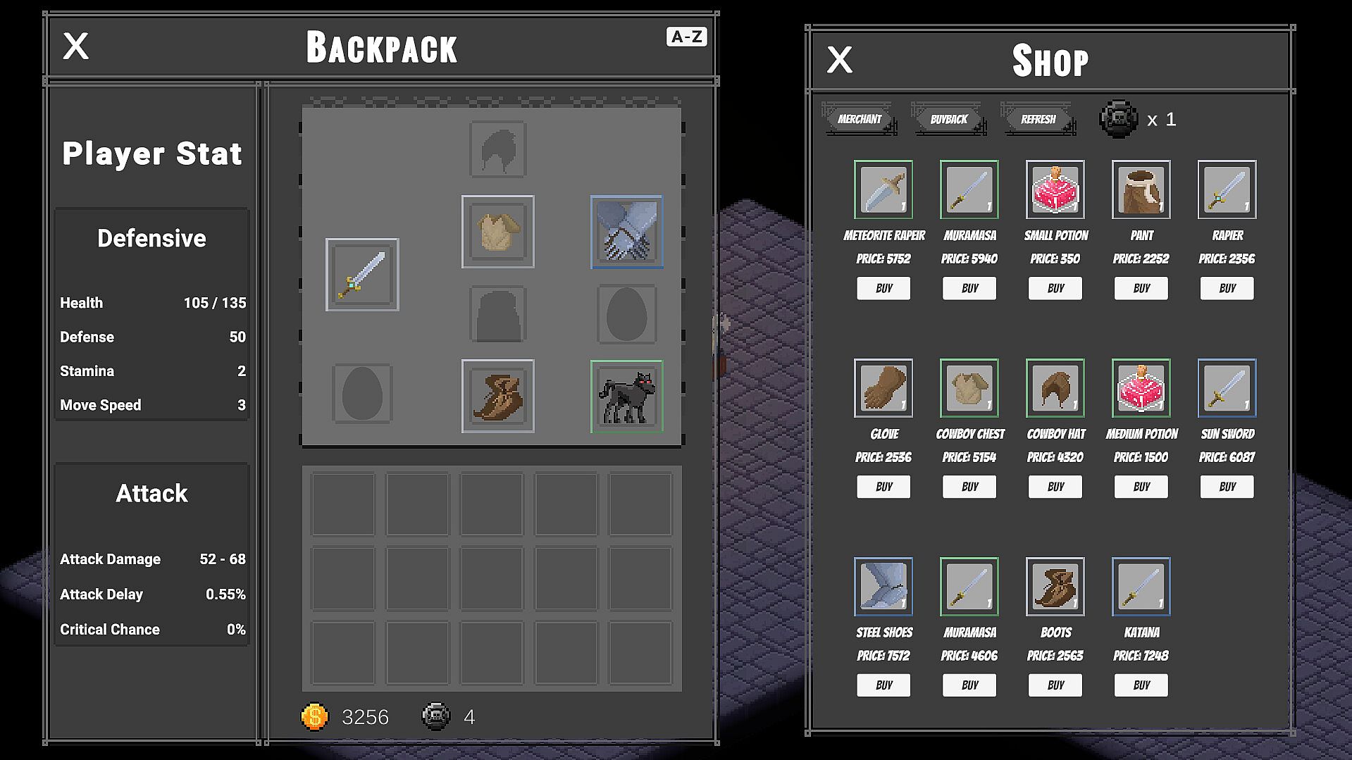 Use the shop system to buy and sell new weapons and equipment.
